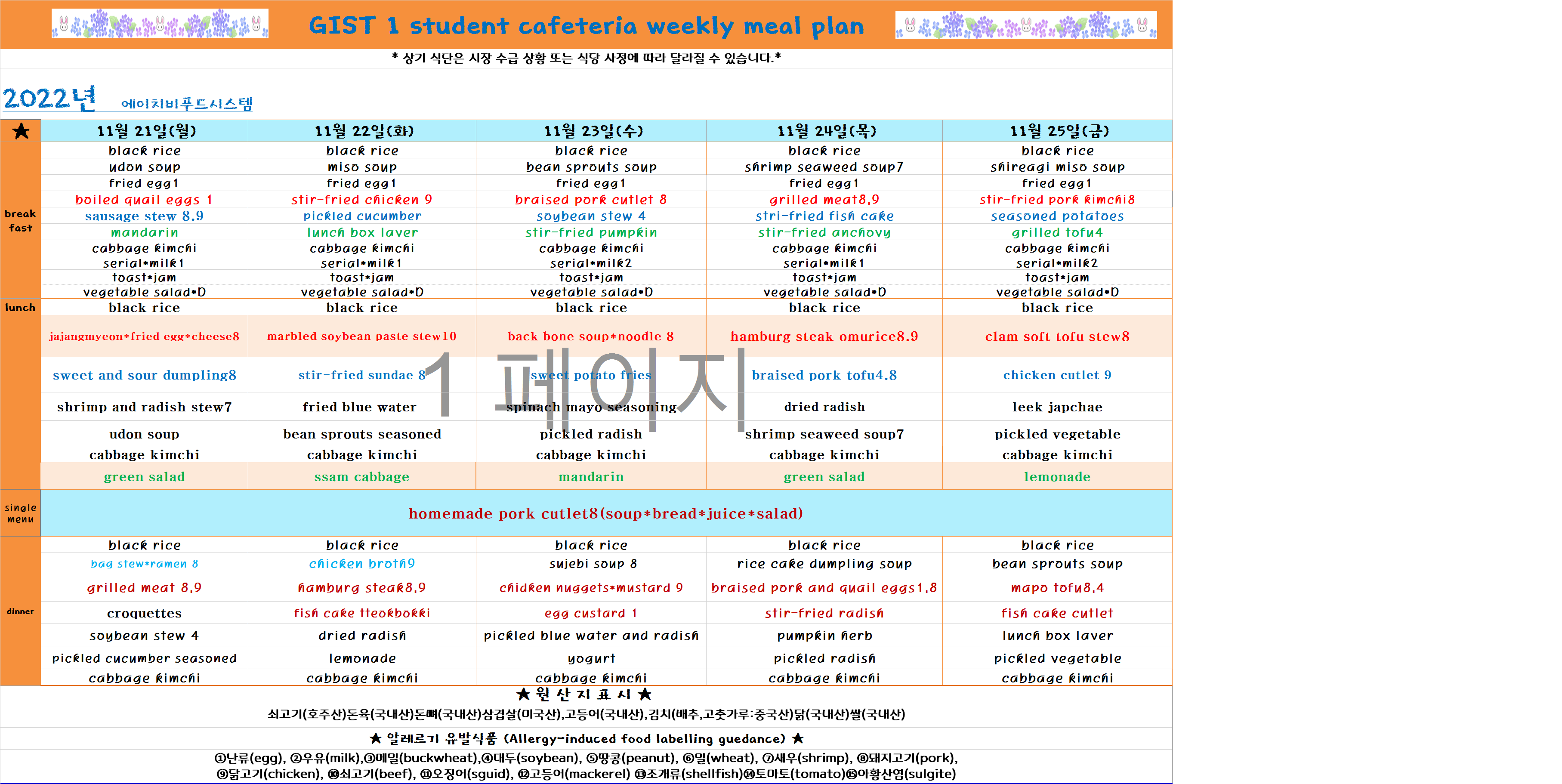 2022년 11월4째주식단표(11월21일~11월25일)
