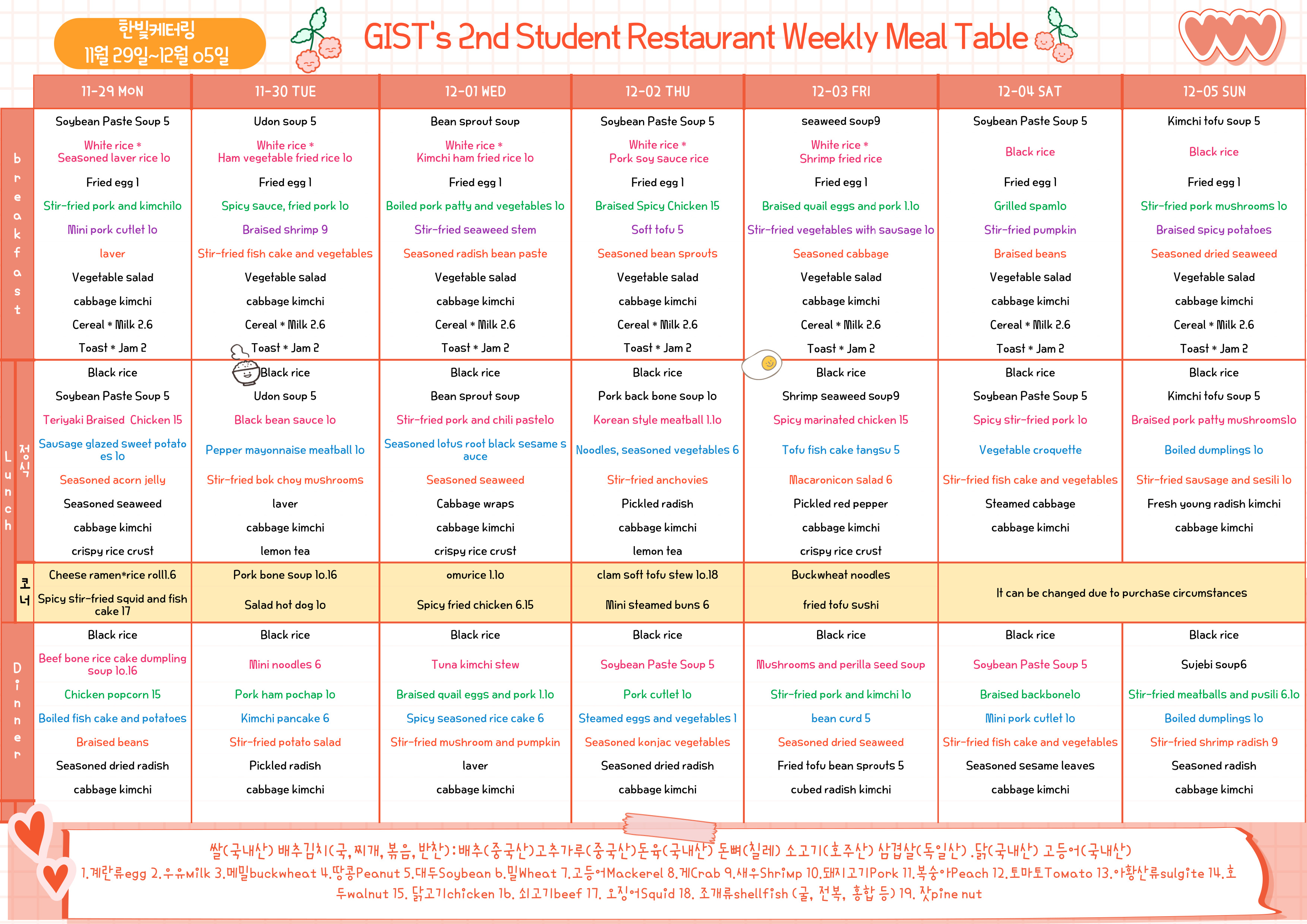 The 2nd Student Restaurant Weekly Meal Table (2021.11.29 ~2021.12.05)