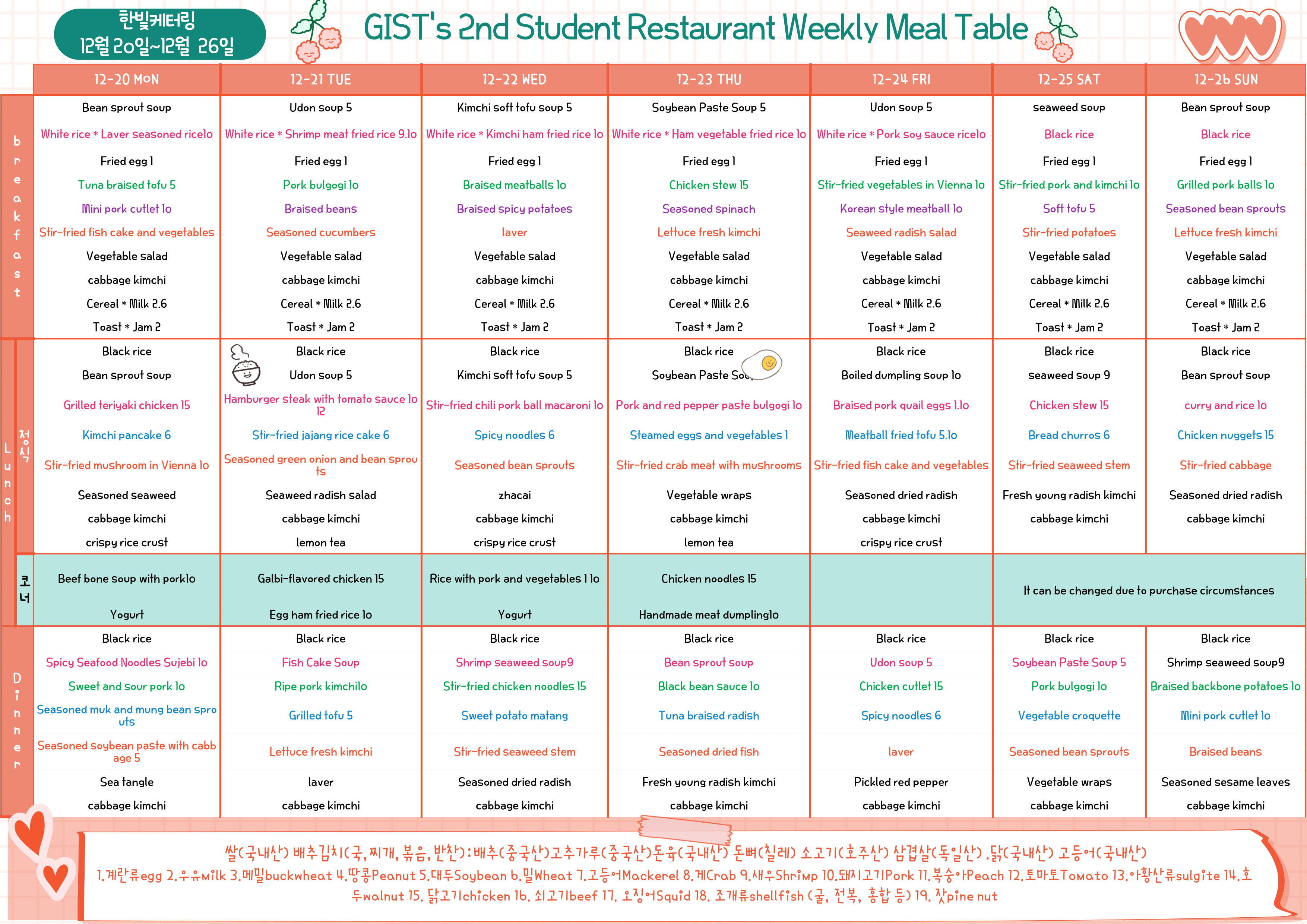 The 2nd Student Restaurant Weekly Meal Table (2021.12.20 ~2021.12.26)