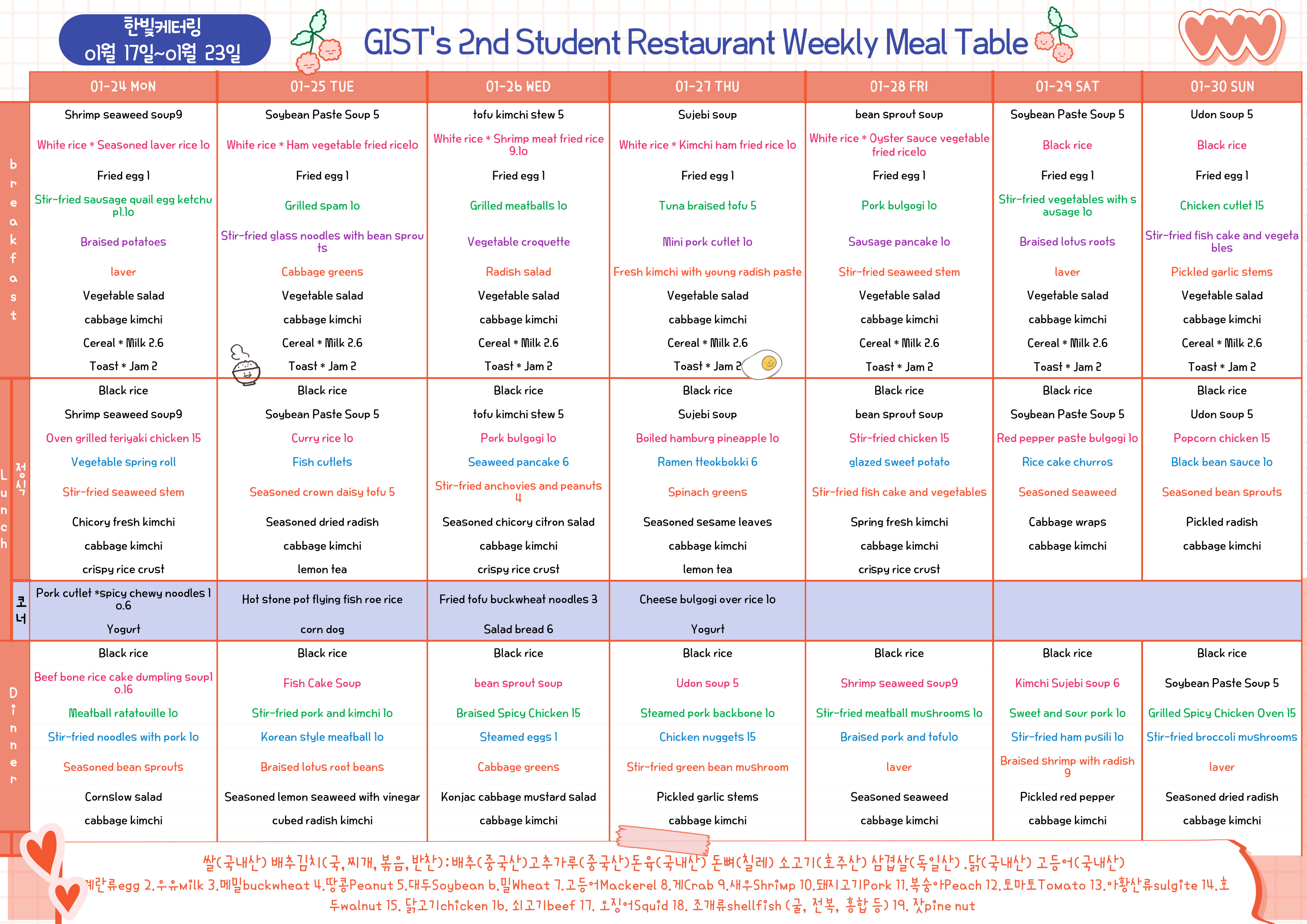 The 2nd Student Restaurant Weekly Meal Table (2022.01.24~22.01.30)