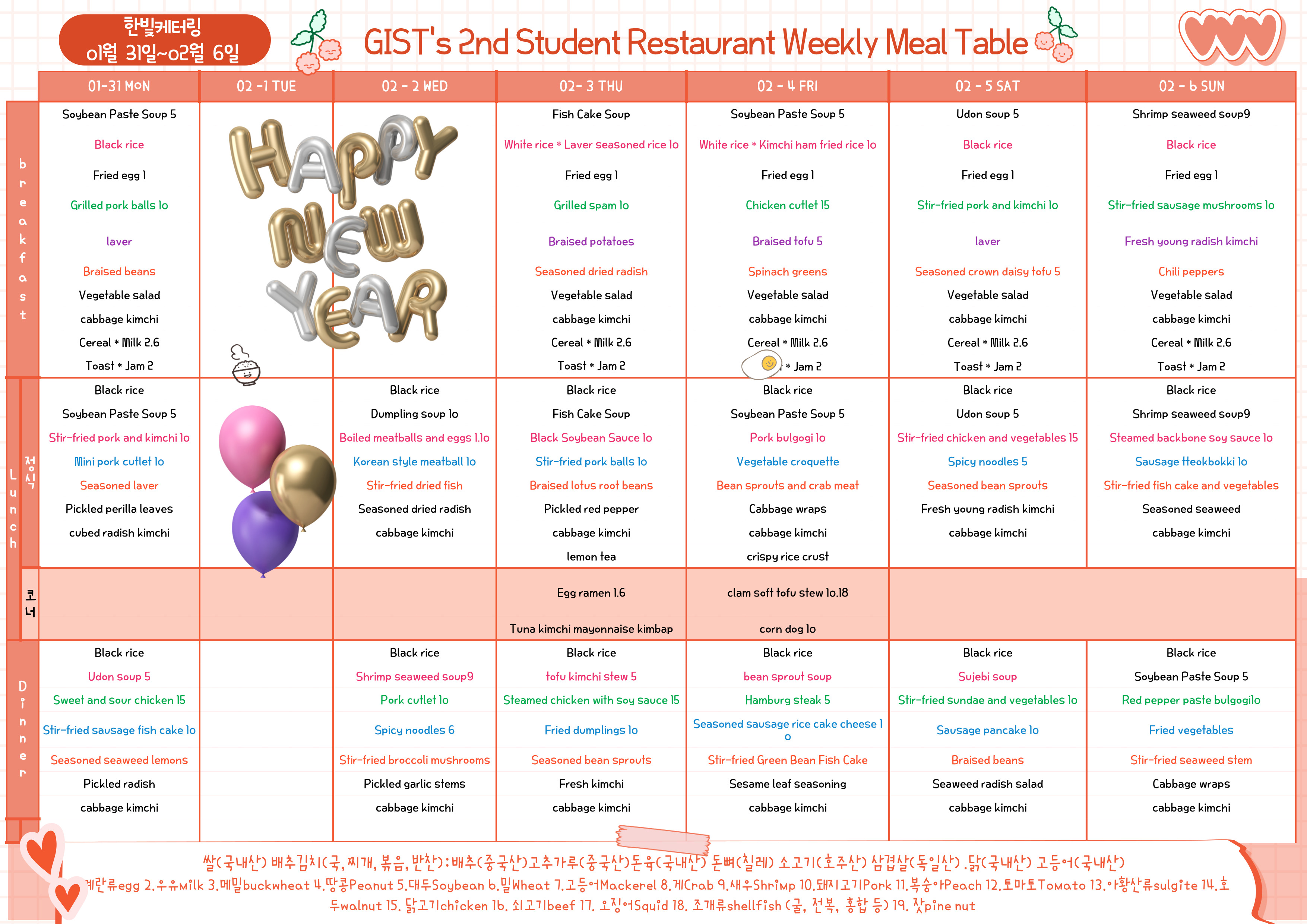 The 2nd Student Restaurant Weekly Meal Table (2022.01.31~22.02.6)