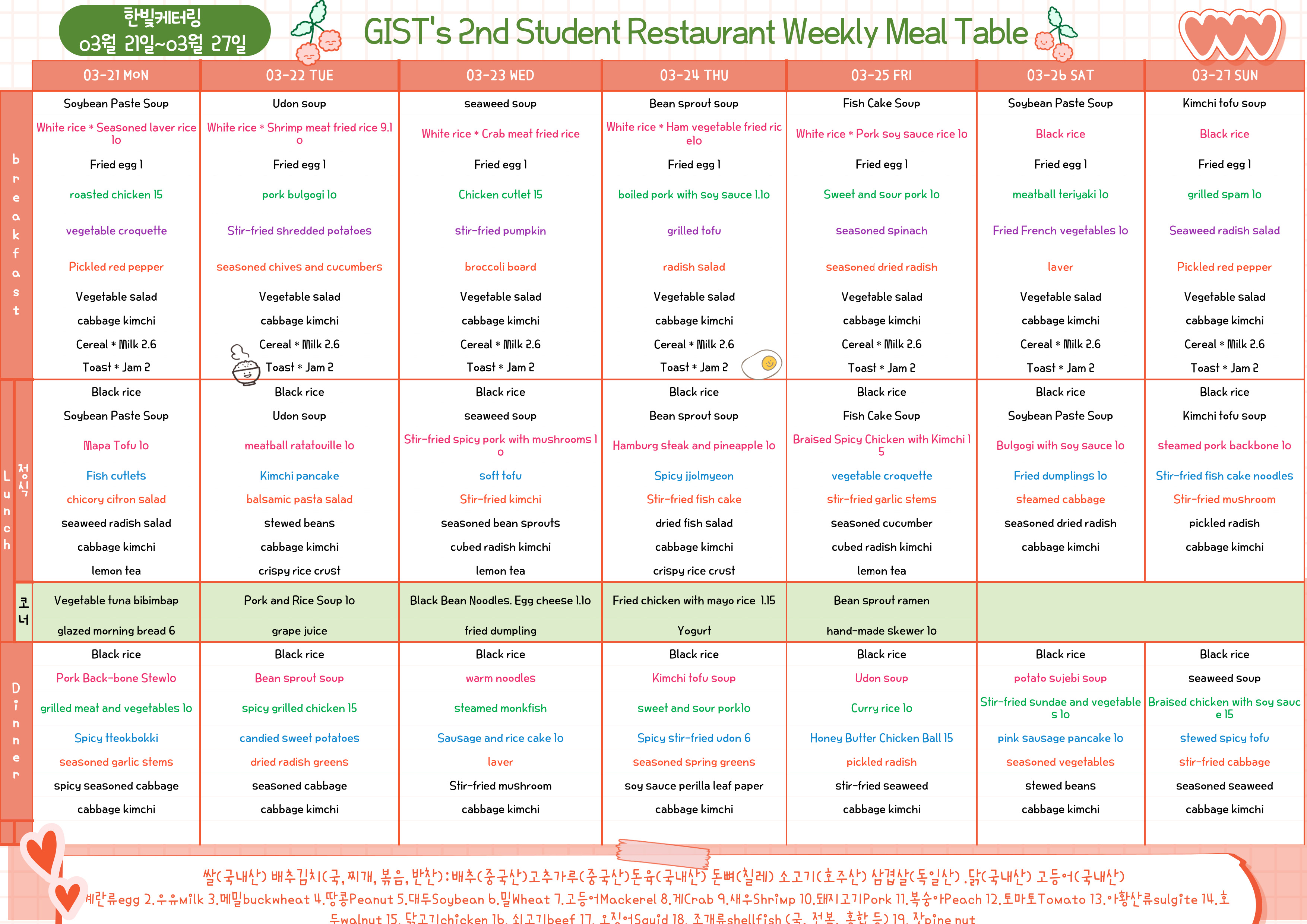 The 2nd Student Restaurant Weekly Meal Table (2022.03.21~22.03.27)