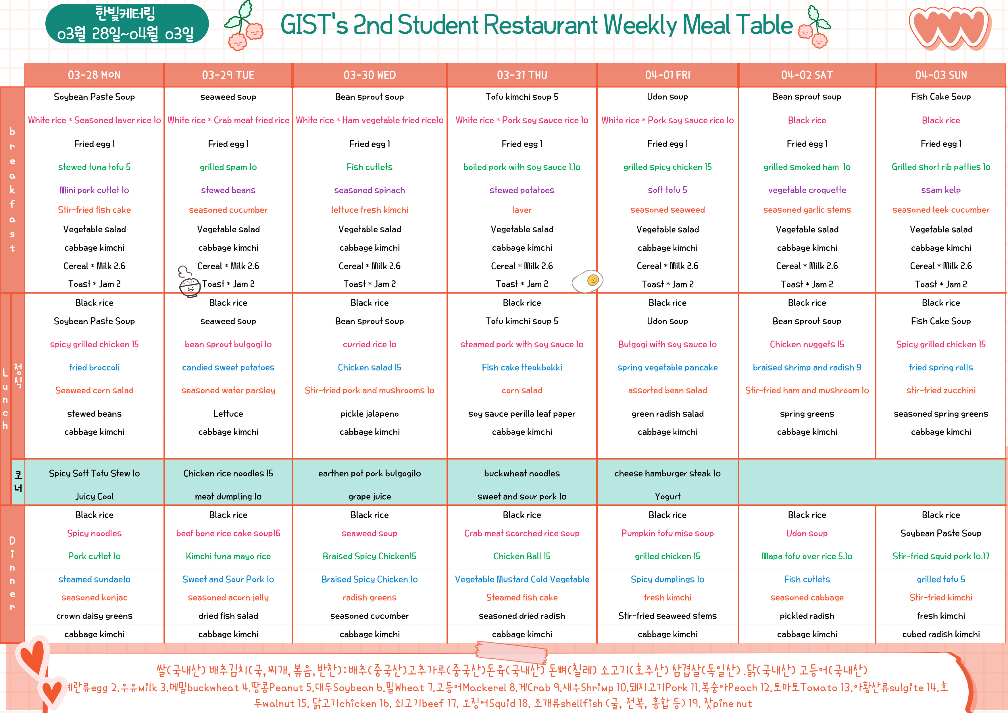 The 2nd Student Restaurant Weekly Meal Table (2022.03.28~22.04.03)
