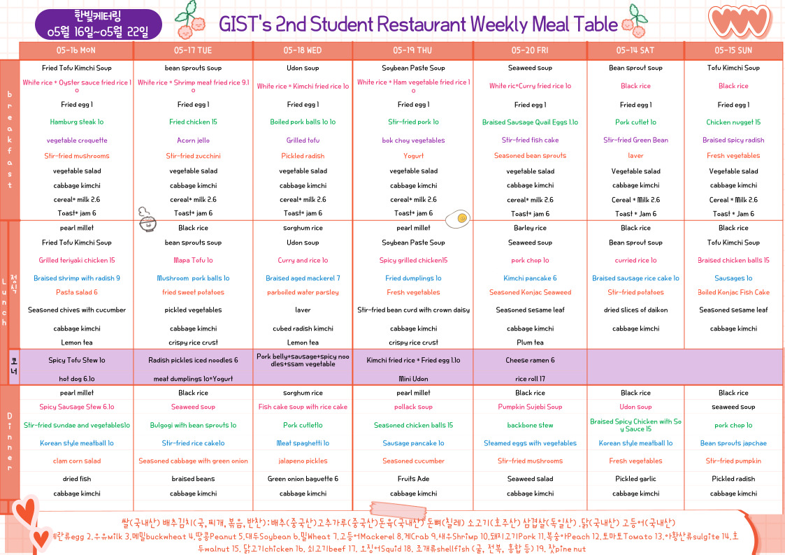 The 2nd Student Restaurant Weekly Meal Table (2022.05.16~22.05.22)