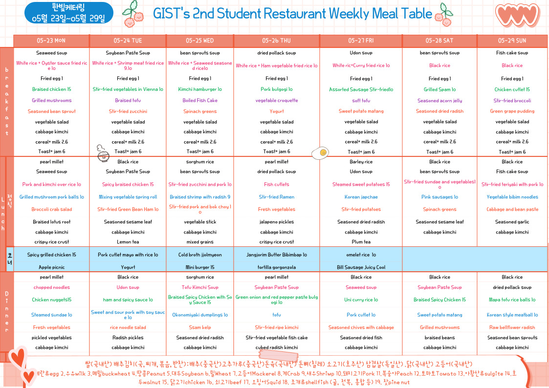 The 2nd Student Restaurant Weekly Meal Table (2022.05.23~22.05.29)
