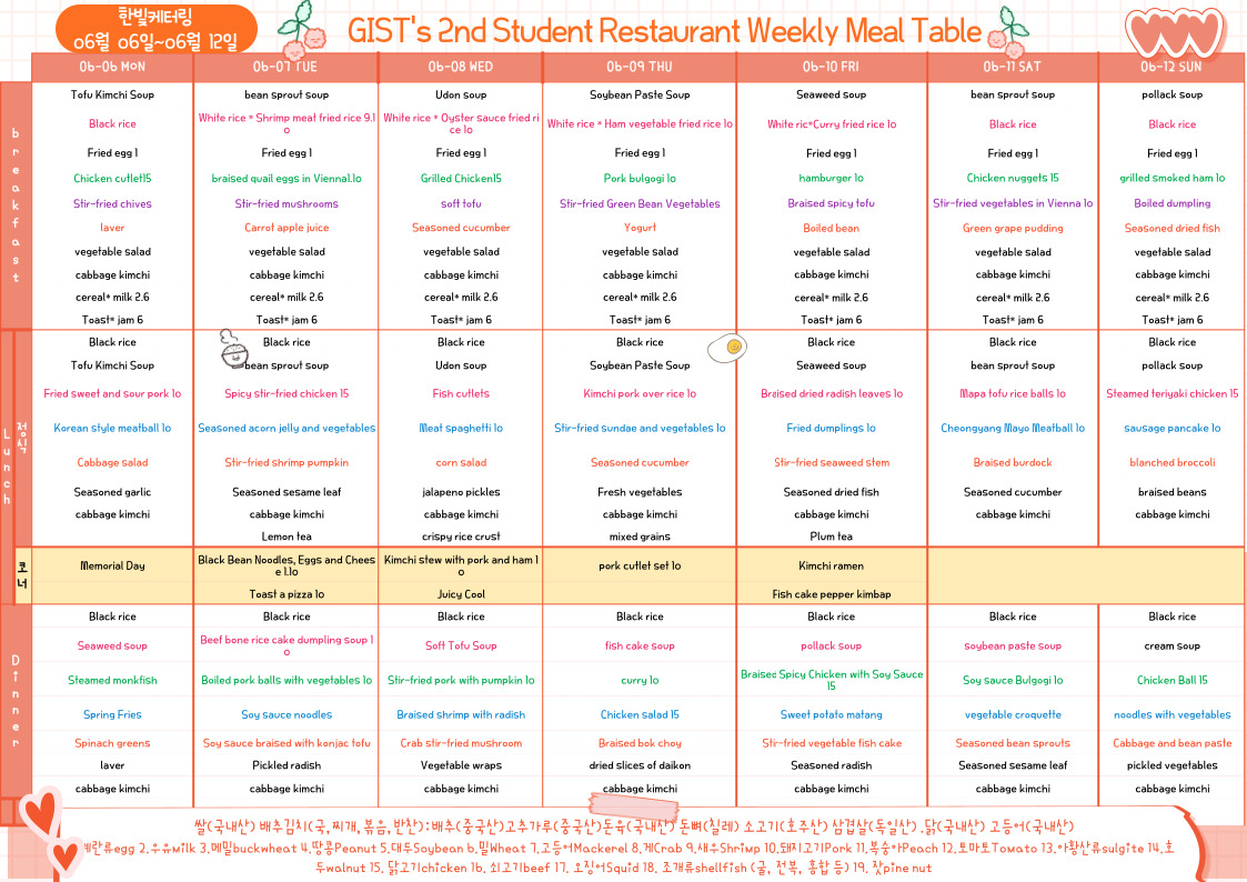 The 2nd Student Restaurant Weekly Meal Table (2022.06.06~22.06.12)