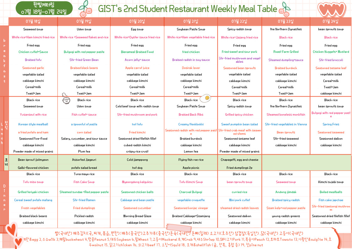 The 2nd Student Restaurant Weekly Meal Table (2022.07.18~22.07.24)