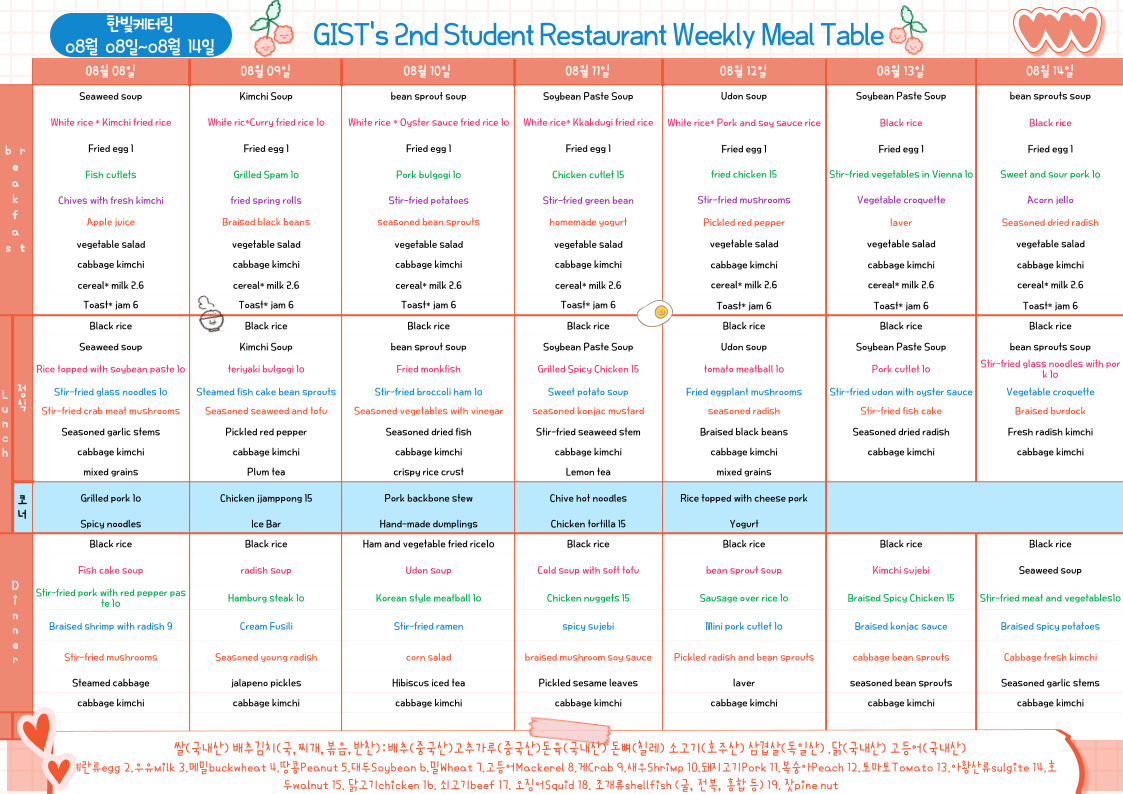 The 2nd Student Restaurant Weekly Meal Table (2022.08.08~22.08.14)