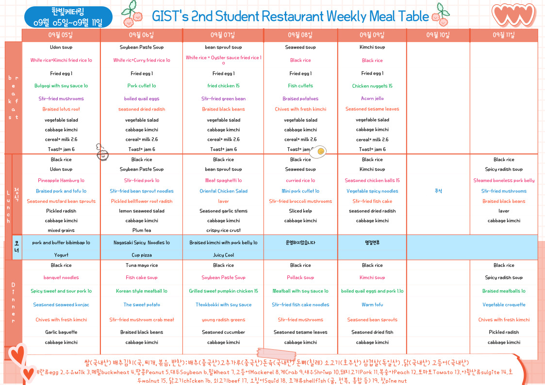 The 2nd Student Restaurant Weekly Meal Table (2022.09.05~22.09.11)