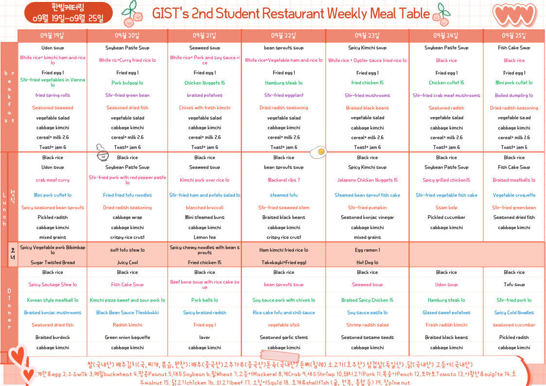 The 2nd Student Restaurant Weekly Meal Table (2022.09.19~22.09.25)