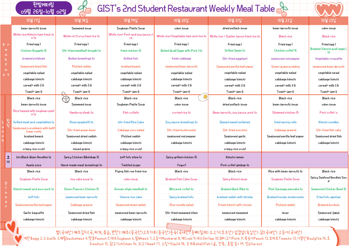 The 2nd Student Restaurant Weekly Meal Table (2022.10.17~22.10.23)