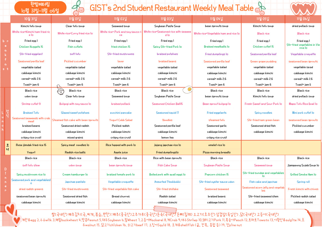 The 2nd Student Restaurant Weekly Meal Table (2022.10.31~22.11.06)