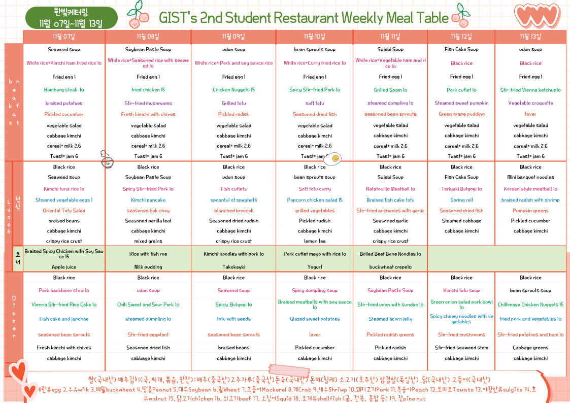 The 2nd Student Restaurant Weekly Meal Table (2022.11.07~22.11.13)