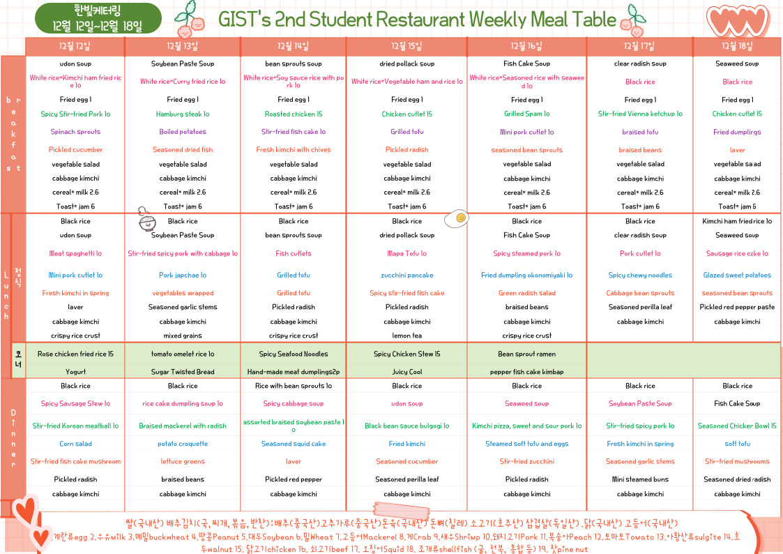 The 2nd Student Restaurant Weekly Meal Table (2022.12.12~22.12.18)