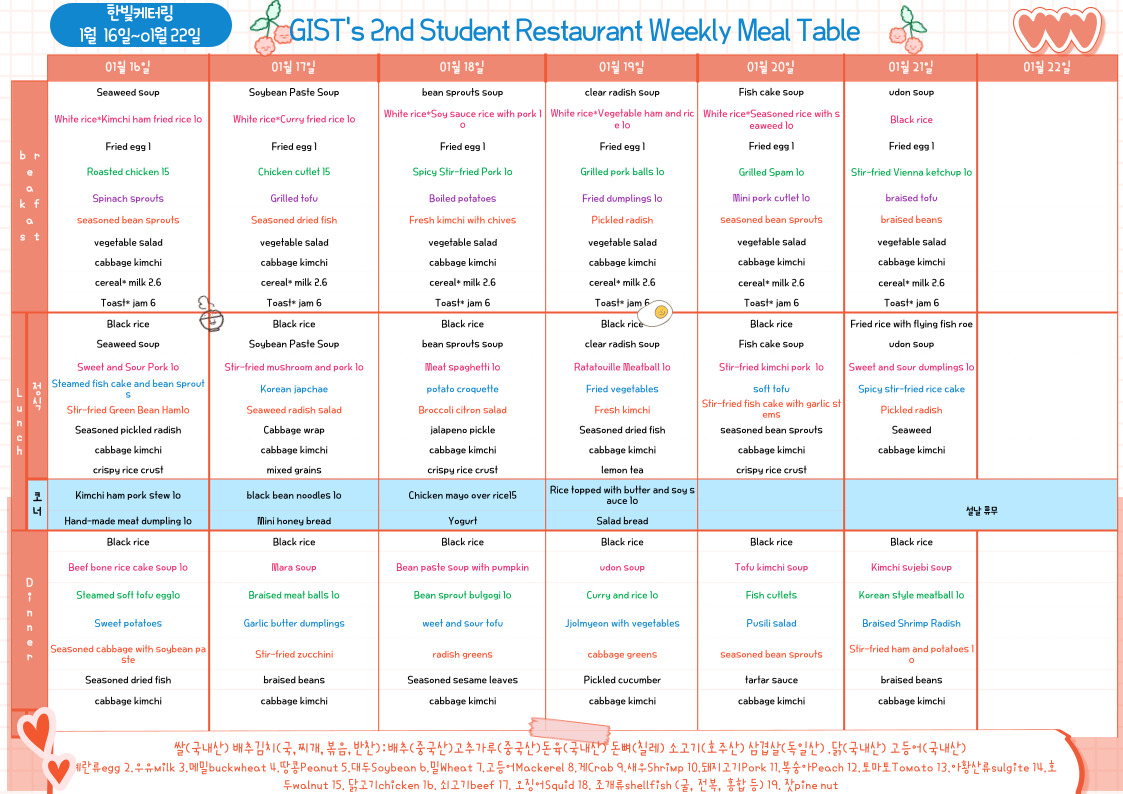 The 2nd Student Restaurant Weekly Meal Table (2023.01.16~23.01.22)
