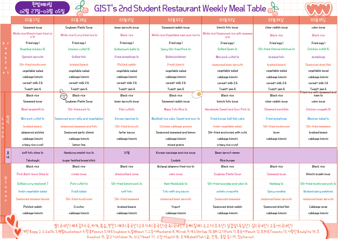 The 2nd Student Restaurant Weekly Meal Table (2023.02.27~23.03.05)