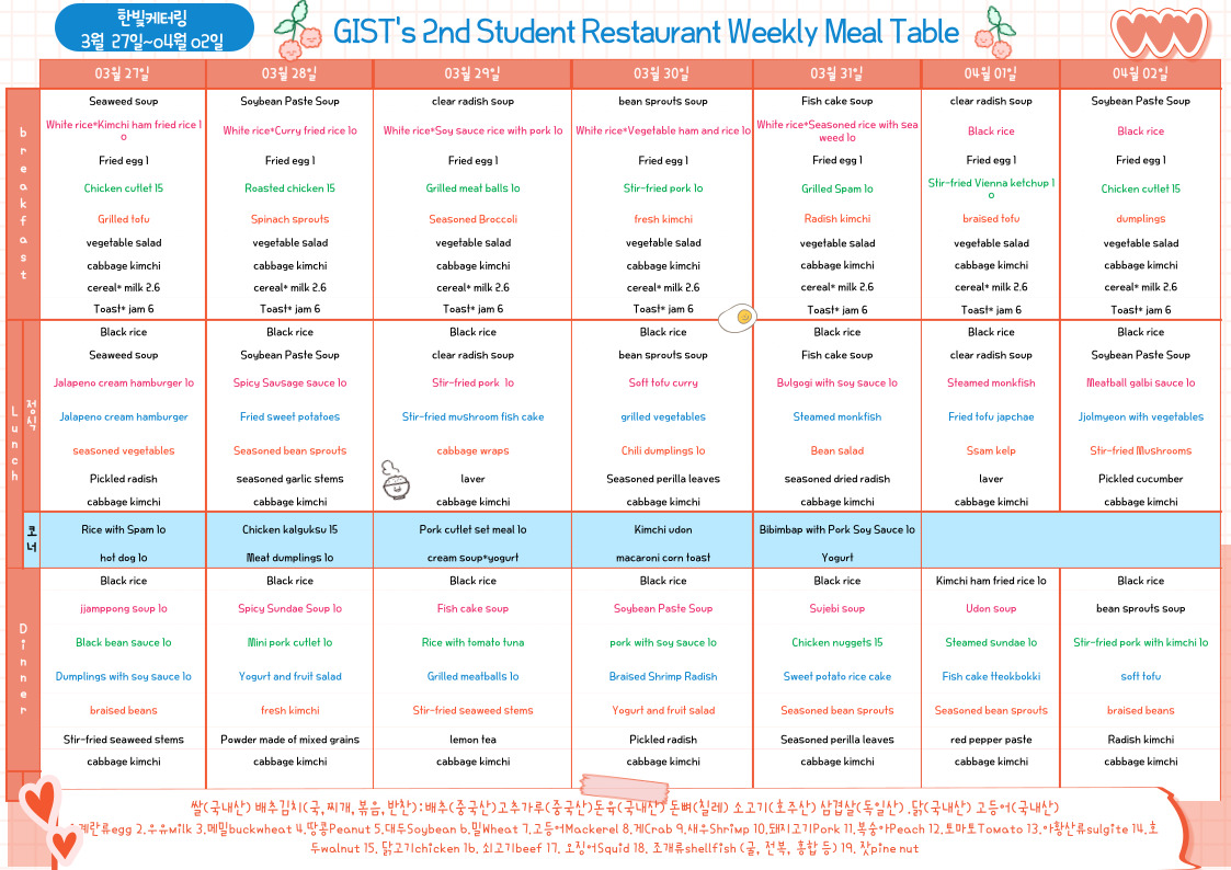The 2nd Student Restaurant Weekly Meal Table (2023.03.27~23.04.02)