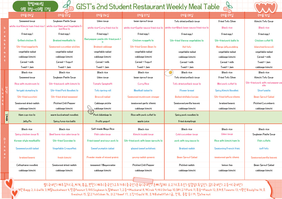 The 2nd Student Restaurant Weekly Meal Table (2023.09.11~23.09.17)