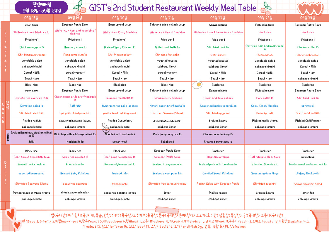 The 2nd Student Restaurant Weekly Meal Table (2023.09.18~23.09.24)