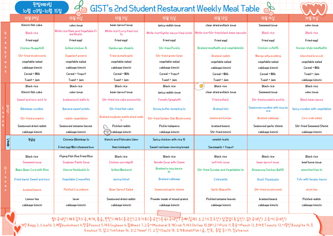 The 2nd Student Restaurant Weekly Meal Table (2023.10.09~23.10.15)