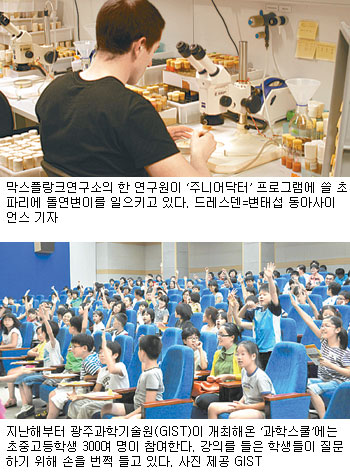 <P><SPAN style="FONT-SIZE: 14pt; COLOR: #000000; FONT-FAMILY: Times New Roman"><BR>Struck with awe at the incredible, high-speed microscope!<BR>“Very different from the one you’ve seen in school, isn’t it? This microscope automatically analyzes how molecular proteins transform themselves. Now, it takes only 15 minutes whereas before it would have taken days,” said group head Marc Bickle. “Wow!” many students exclaimed as they observed the speed of operation. Ms. Lisatron (Ortrent Gymnasium, 9th grader) asked about the principles involved in the operation of the so-called ‘high-speed microscope.’ The reply, “it has an embedded program enabling users to take pictures for molecular analysis,” adding “like computers, this microscope has as many as 2,500 CPUs built into the system.” <BR> <BR>Mr. Kirian Strasove (Kosbig Gymnasium, 9th grader) was astounded, commenting, “I learned that computers are also used to observe molecules, not just to play games.”<BR><BR>The Junior Doctor Program kicked off after Dresden was chosen as the ‘City of Science’ by the Donors Association for Development of German Science. Befitting its name, voluntary participation by well-trained scientists ensure the uniqueness and effectiveness of the program. Every year, 30 scientists from 25 universities and research institutes specializing in science and engineering, including Dresden University of Technology, CBG and University Hospital Carl Gustav, enthusiastically contribute towards program success. <BR> <BR>After lectures, orators gave challenging pop quizzes, students being awarded stamps for correct answers. Moreover, students receiving 7 or more stamps earned a junior doctor degree at program’s end in July. Impressively, half of the 200 participants receive such honors every year. Florian Frisch, a staff in charge said, “Students take pride in becoming ‘doctors’ before entering college, making them more interested and enthusiastic about science.”<BR><BR>A researcher at Max Planck Institute examines artificial<BR>mutations in drosophila for use in the Junior Doctor <BR>Program. Dresden, by Tae-sub Byun, DongaScience<BR> <BR>Three-hundred primary and secondary school students participate <BR>in the second annual ‘Science School’ launched by GIST last <BR>year. After the lecture, students raise hands to ask <BR>questions. Photograph provided by GIST <BR><BR>○ Events such as ‘Science school’ helps to meet the needs of primary school students<BR>Like other countries, Korea is also increasing the number of activities in which scientists share knowledge of science and technology with the interested public. Accordingly, Gwangju Institute of Science and Technology (GIST) launched ‘Science School’ last year.<BR> <BR>GIST professors and doctoral researchers give special lectures once a month to three-hundred children, ninety percent of the participants being primary school students. <BR><BR>As is the case of the Junior Doctor Program, the lecturers themselves determine subject matter during the twelve-lecture science program. <BR> In an October lecture delivered by In-sub Chang, professor of Environmental Engineering, on microorganisms, he addressed two children – a 3rd and 6th grader-- by commenting, “invisible to the eyes, young students marvel at the story of electricity-producing microorganisms.” <BR> <BR><BR> <BR> <BR></P></SPAN>