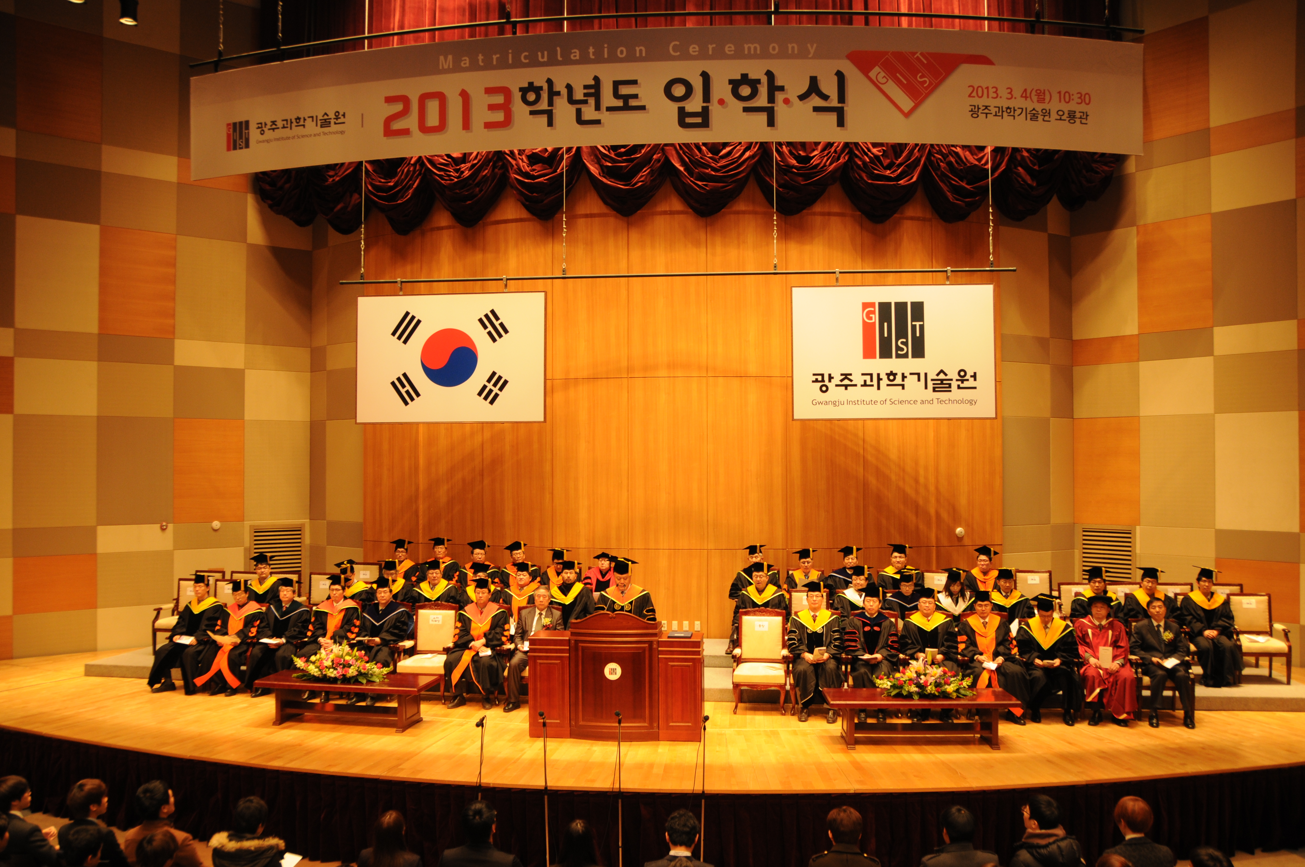 Held the 2013 GIST entrance ceremony - A total of 350 new students entered GIST including 19 foreign students - GIST’s President Young Joon Kim emphasized “communication with other areas” On March 4, 2013, Gwangju Institute of Science and Technology (GIST/ President Young Joon Kim) held the 2013 entrance ceremony for undergraduate programs and graduate programs at the main auditorium of Oryong Hall at 11am. At the entrance ceremony, GIST welcomed a total of 350 new students, including 108 students in college degree program,152 students in master’s course, 73 students in doctor’s course, and 17 students in master’s and doctor’s integrated course with 19 foreign students from 12 different countries. At the congratulatory speech, the President Young Joon Kim said, “GIST celebrates the 20th anniversary of its establishment this year. Despite the small size, it has developed into a university with world-class research capacity due to the efforts of the teaching staff and students along with the full support from the Korean government. We will work towards creating a pleasant school life with the best research and educational system for new students.”