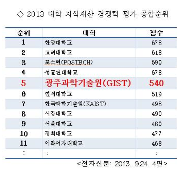 GIST Ranked 5th in Evaluation of IP Competitiveness of Universities Gwangju Institute of Science and Technology (GIST, President Young Joon Kim) ranked 5th in ‘2013 University IP Competitiveness Evaluation” conducted by Electronic Times. The evaluation was performed around the end of September. Especially, in ‘IP Global Competitiveness’ GIST was a dominant No. 1, beating out all competitors and in IP Capability, GIST retained the top spot, ranking 5th among universities across the nation. In the IP evaluation in 57 knowledge indicators in 4 areas of IP culture, global competitiveness, IP competence and industrial contribution, the first of its kind introduced and performed by Electronic Times, GIST ranked 5th in total ranking following Hanyang University, Korea University, Postech and Sungkyunkwan University. Other universities on the list include Yonsei University (6th), KAIST (7th), Sogang University (8th), Seoul National University (9th), Kyunghee University (10th) and Ewha Woman’s University (11th). Among the 4 evaluation areas, GIST showed superb performance over other universities in ’IP global competitiveness’ to evaluate overseas activities and contents of those activities based on international patent application/registration, joint research with foreign research institutes and standard patent management and especially received perfect score in No. of patents registered overseas and joint research with foreign partners. For the key drivers for the superb performance of GIST in IP global competitiveness, Electronic Times pointed out GIST’s internal policy to make international application for more than 50% of domestic patents and active joint research with world prestigious institutions including education and research partnership with Caltech, one of the best universities in engineering and technology in the world.