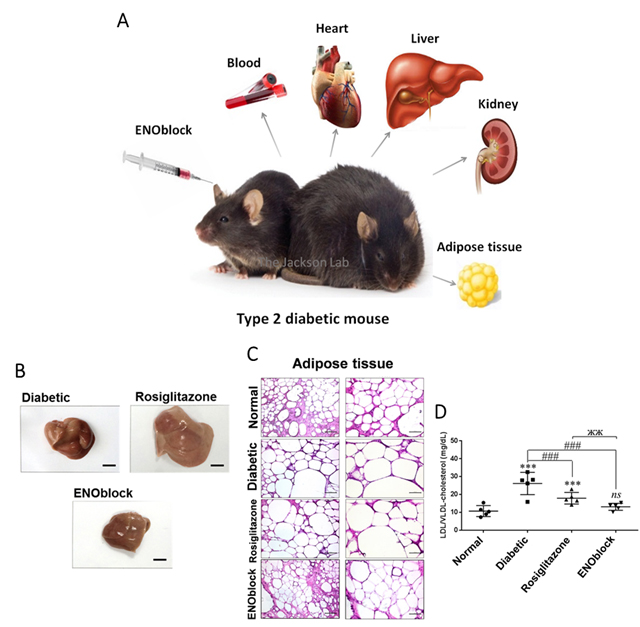 Professor Darren Williams said, "As diabetes progresses, complications associated with diabetes damage various tissues and organs, including vascular tissues, nerves, and kidneys, which can shorten a person's lifespan. ENOblock is expected to be a new drug candidate for diabetes, which is effective in suppressing diabetic complications, as it improves hyperglycemia and hyperlipidemia, which are symptoms of diabetes, and as it reduces cell death, inflammation, and fibrosis."