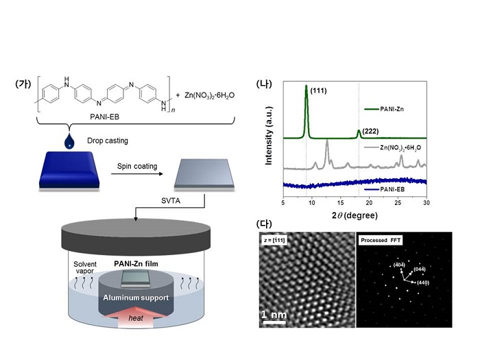 * In addition, a thin film of 100 nm thick was formed with a mixture of polyaniline * and zinc ion, followed by a simple solvent vapor heat treatment process to induce coordination between the nitrogen atom (N) and the zinc ion in the polyaniline structure. During the heat treatment of the solvent vapor, the zinc ion in the mixture thin film is positioned between the polyaniline polymer chains and forms a crosslinked structure by coordination bonding, thereby reducing the random motility of the polymer chain and inducing regular arrangement control.
