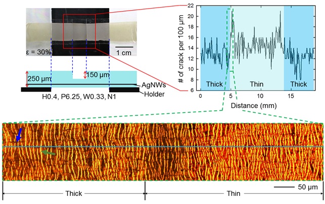∘ When the element is deformed, the elongation of the thick part and the thin part of the elastic body is different, leading to the distribution of non-uniform cracks in the sensor layer. It was confirmed by optical analysis that a high number of cracks occurred at the boundary between the thick and thin parts.