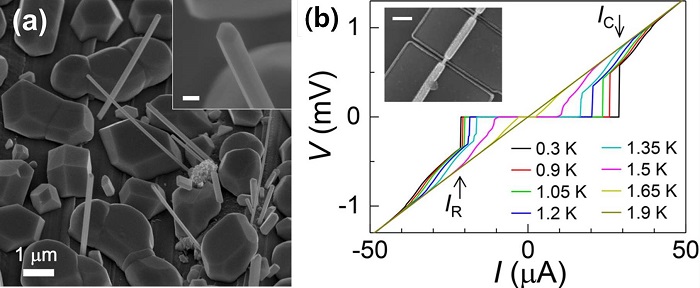 □ Professor Yong-Joo Doh and Professor Bongsoo Kim use a superconducting aluminum electrode on silver-selenium (Ag2Se) phase-insulated nanowire to fabricate a super-current transistor. The statistical measurement of the superconducting-steady-state current distribution in the vicinity of the critical current of the superconducting current in the device has experimentally observed that a macroscopic quantum penetration of superconducting current occurs at an absolute temperature of less than 0.8 Kelvin.