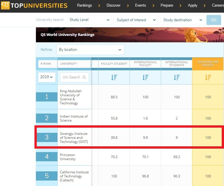 GIST is ranked third in the world for citations per faculty in the 2018