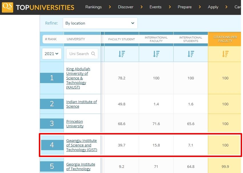 GIST ranks in the world's top 4 in science and technology research capabilities (2020 QS World University Assessment)