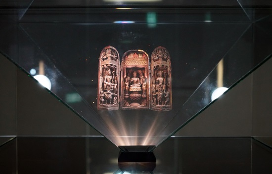 ∘ First, the National Treasure No. 42 is a very small wooden block with a height of 13.9 cm and a width of 17 cm. It was digitized by 3D mesh data restoration technology to recreate delicate and detailed texture of the Buddha image. In addition, a 4-sided hologram system was used to create a lively atmosphere for the artifacts.