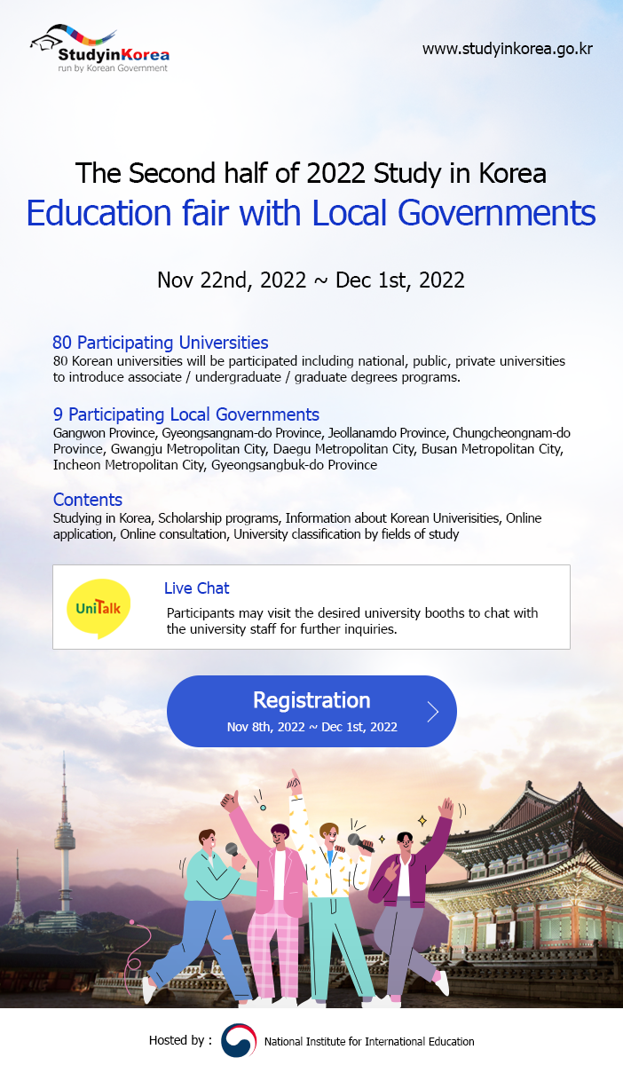It is our pleasure to announce that NIIED will hold 2022 Study in Korea Online Education Fair(the Second half) for international students.