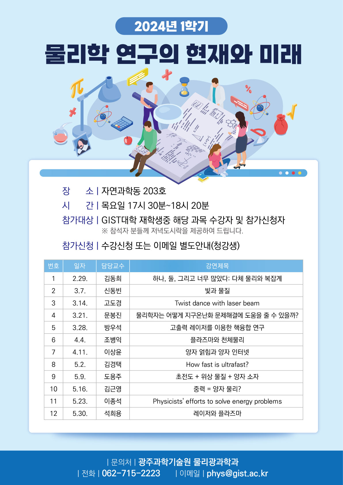 2024년 1학기 물리광과학 세미나를 아래와 같이 안내드립니다.