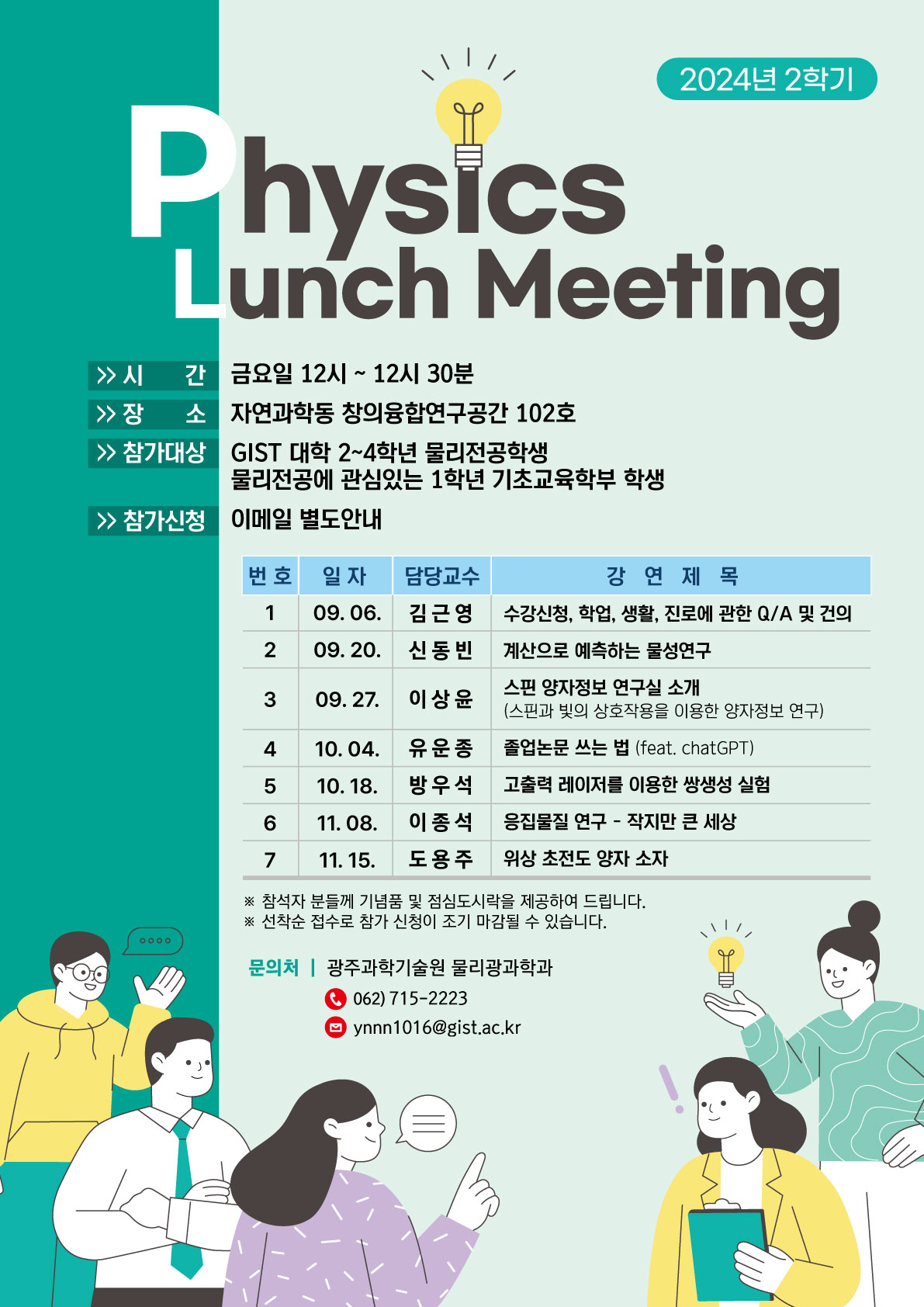 관련하여 궁금하신 점은, 물리광과학과 (정유나, ynnn1016@gist.ac.kr)로 문의 바랍니다.