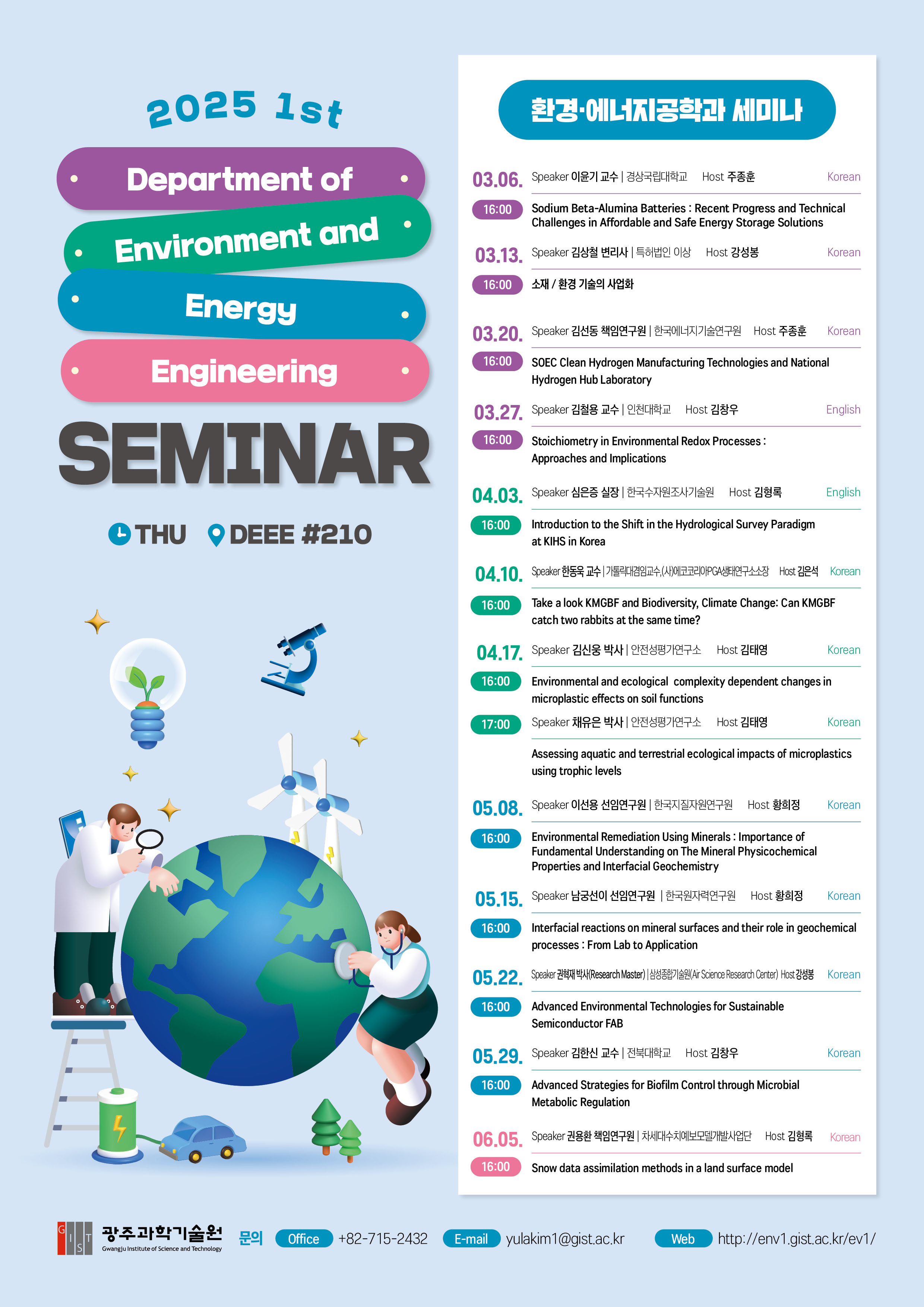2025-1학기 환경공학 세미나를 아래와 같이 안내드립니다. 관심있으신 분들의 많은 참여 바랍니다.