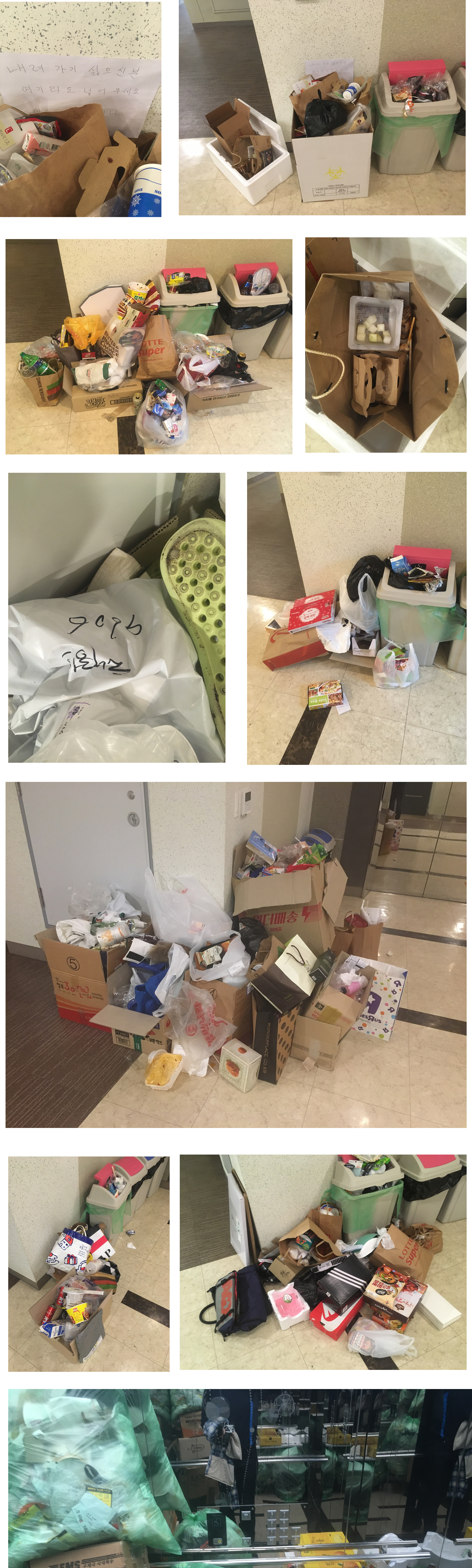 그렇지 않다면 현 문제에서 가장 큰 피해자인 청소용역분들에게 추가적인 보수를 지원하여야 할 것 같습니다. 첨부파일(hell.png)을 보시면아시겠지만 매 주말마다 사람 1명 크기의 쓰레기들이 매 층마다 나옵니다. 그것을 모으면 엘리베이터 반이 가득 채워지는데, 그것들을 청소를 담당하고 계시는 분들이 묵묵히 치워주고 계십니다. 저는 이것이 굉장히 부당하다고 생각하는게, 원래 쓰레기장에 직접 버려야될 쓰레기들, 심지어 음식물 쓰레기들이 포함된 배달 쓰레기들이 고스란히 복도에 남아 청소용역하시는 분들이 의무에도 없는 일들을 계속 하고 계십니다.
