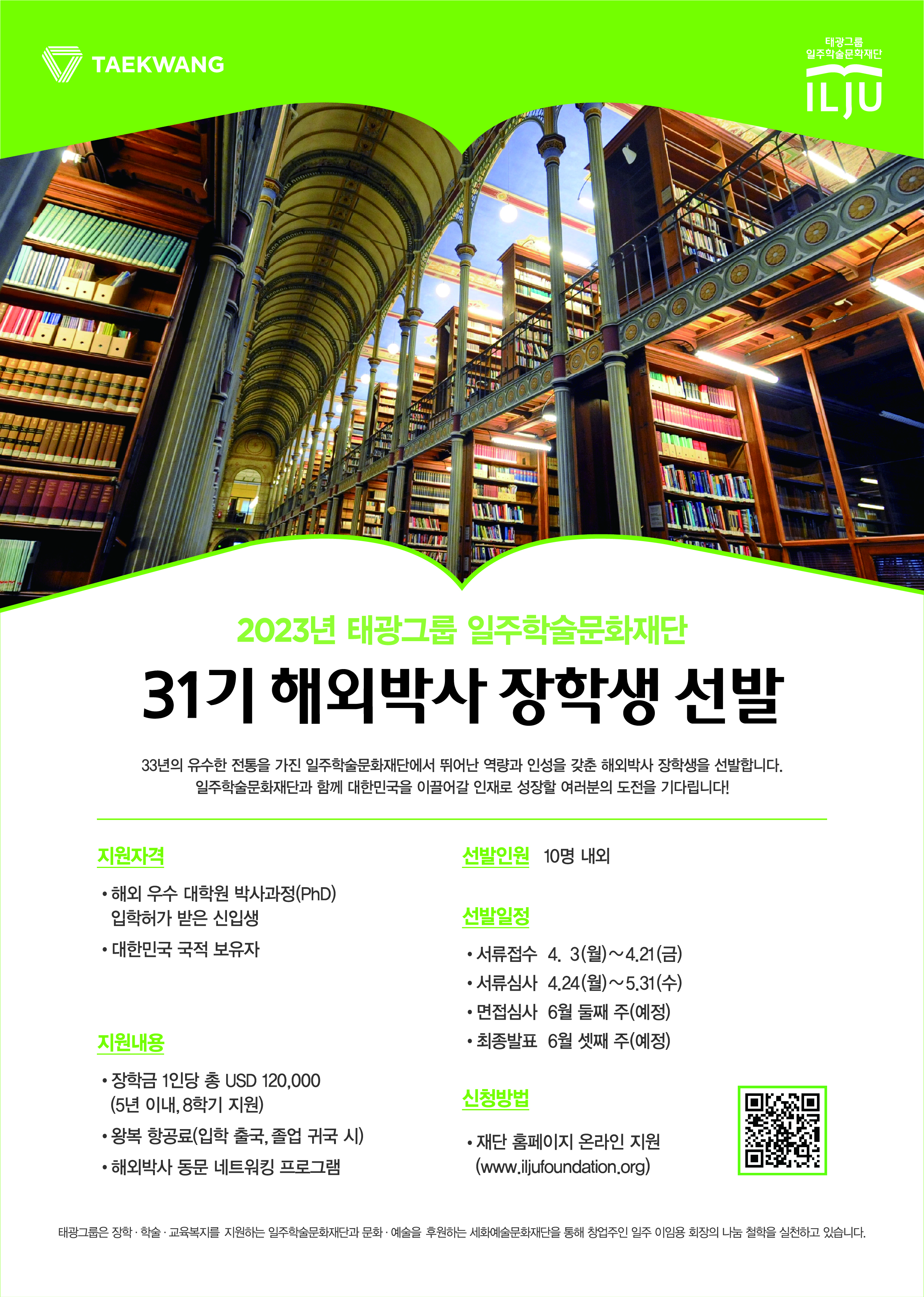 33년의 유수한 전통을 가진 일주학술문화재단에서 뛰어난 역량과 안성을 갖춘 해외박사 장학생을 선발합니다.