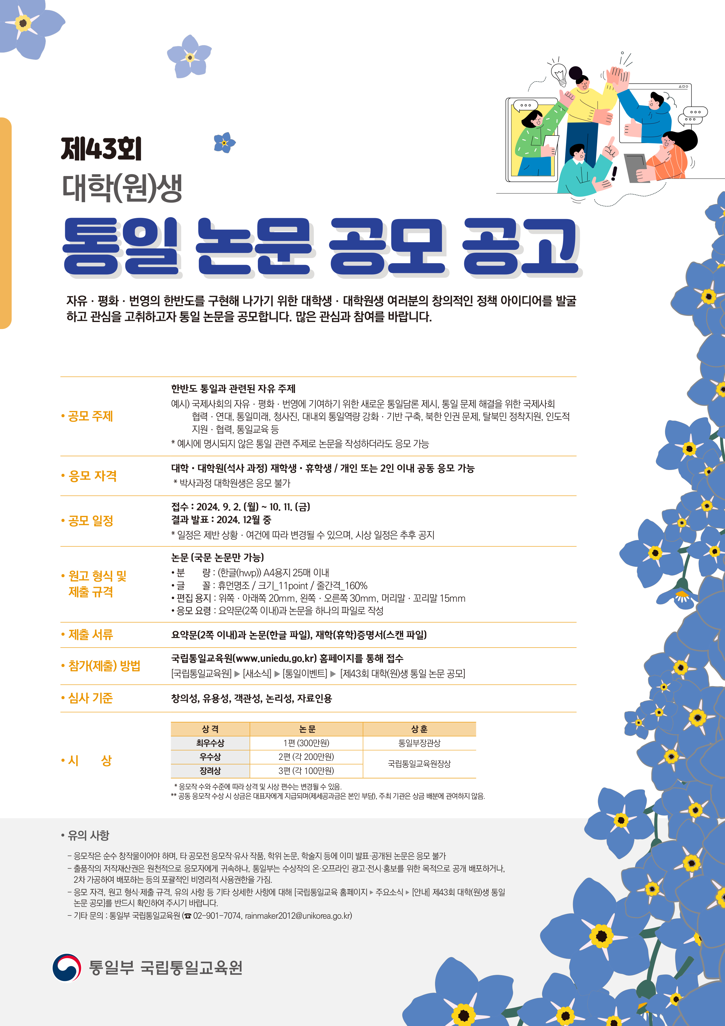 통일부 국립통일교육원에서 아래와 같이 대학(원)생 통일 논문을 공모하오니