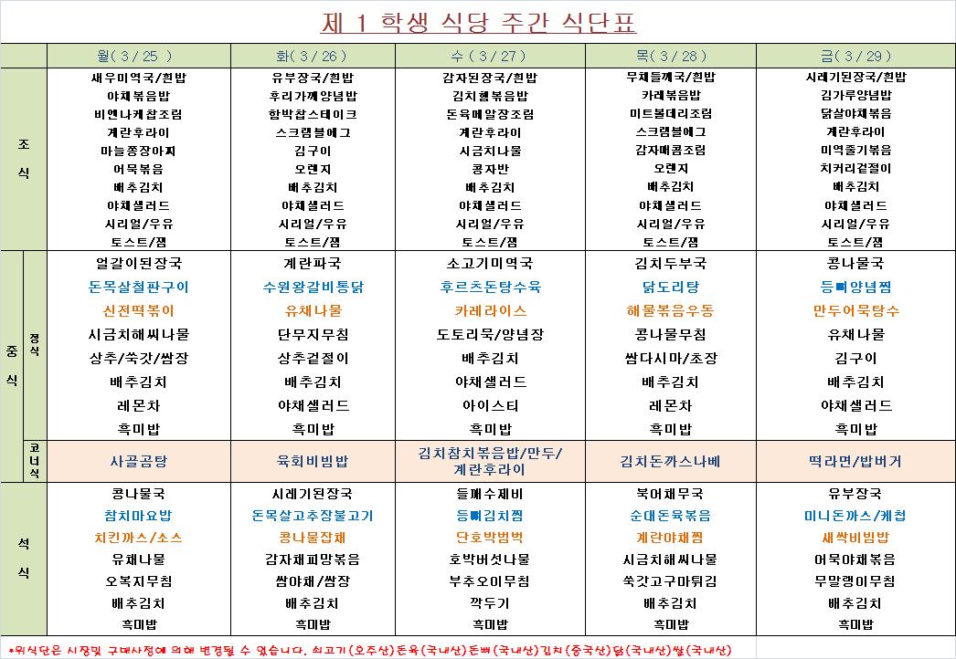 주간 식단표(3.25~3.29)