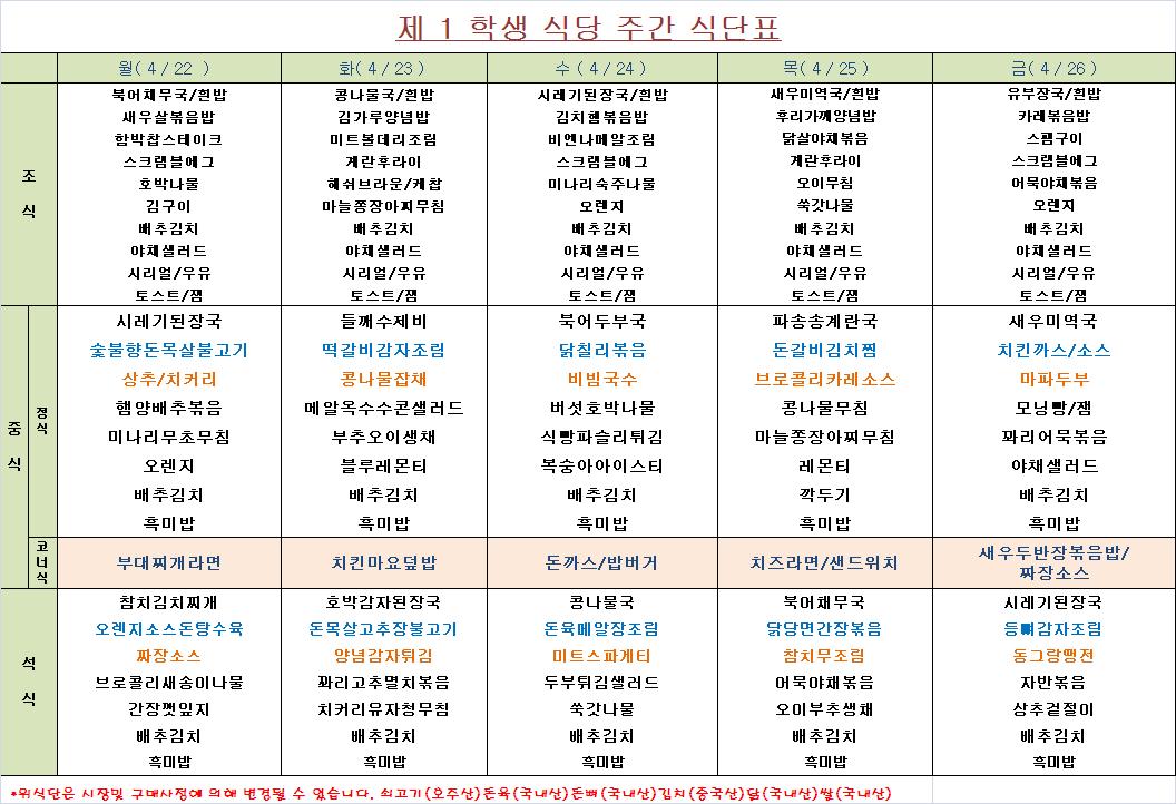 주간 식단표(4.22~4.26)