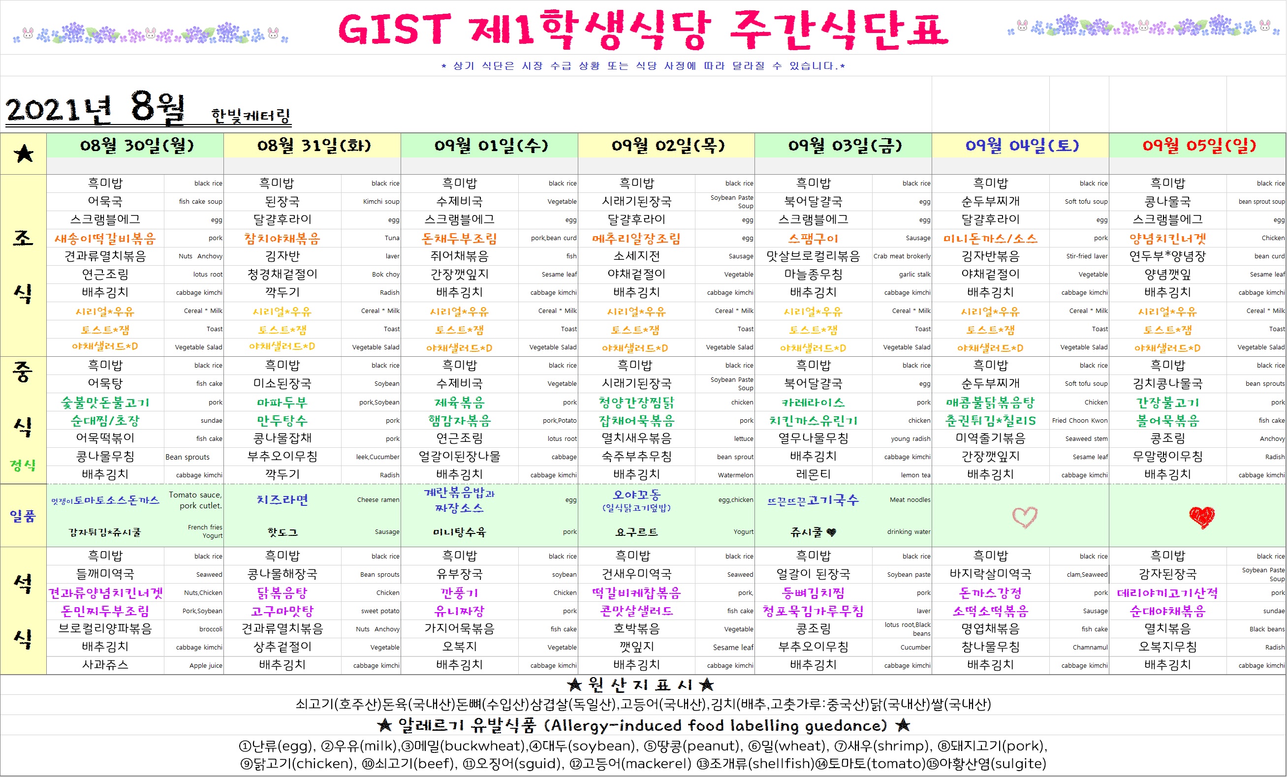 1학생식당 식단표 (08월 30일 -09월 05일)