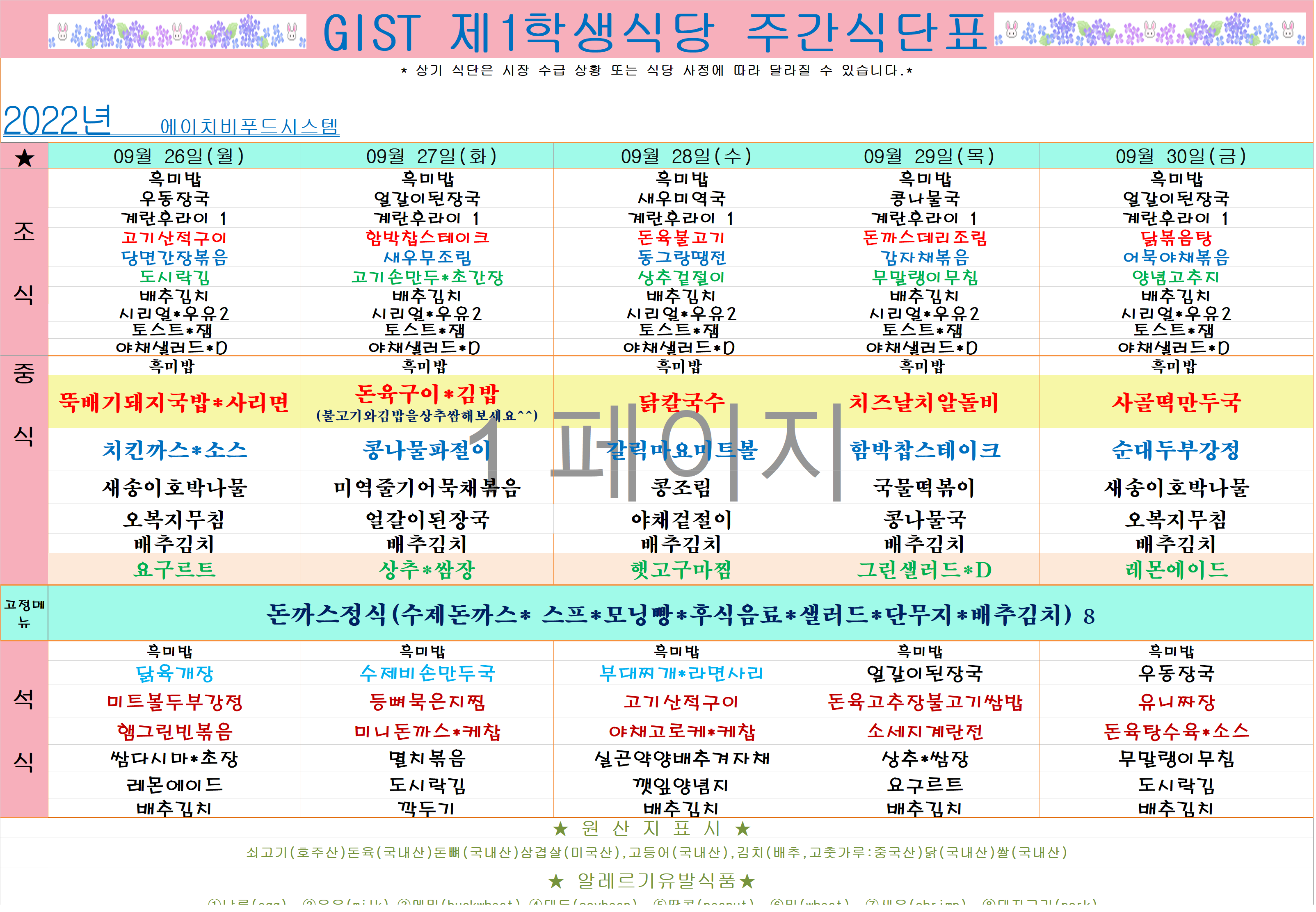 2022년 9월4째주식단표(9월26월~9월30일)