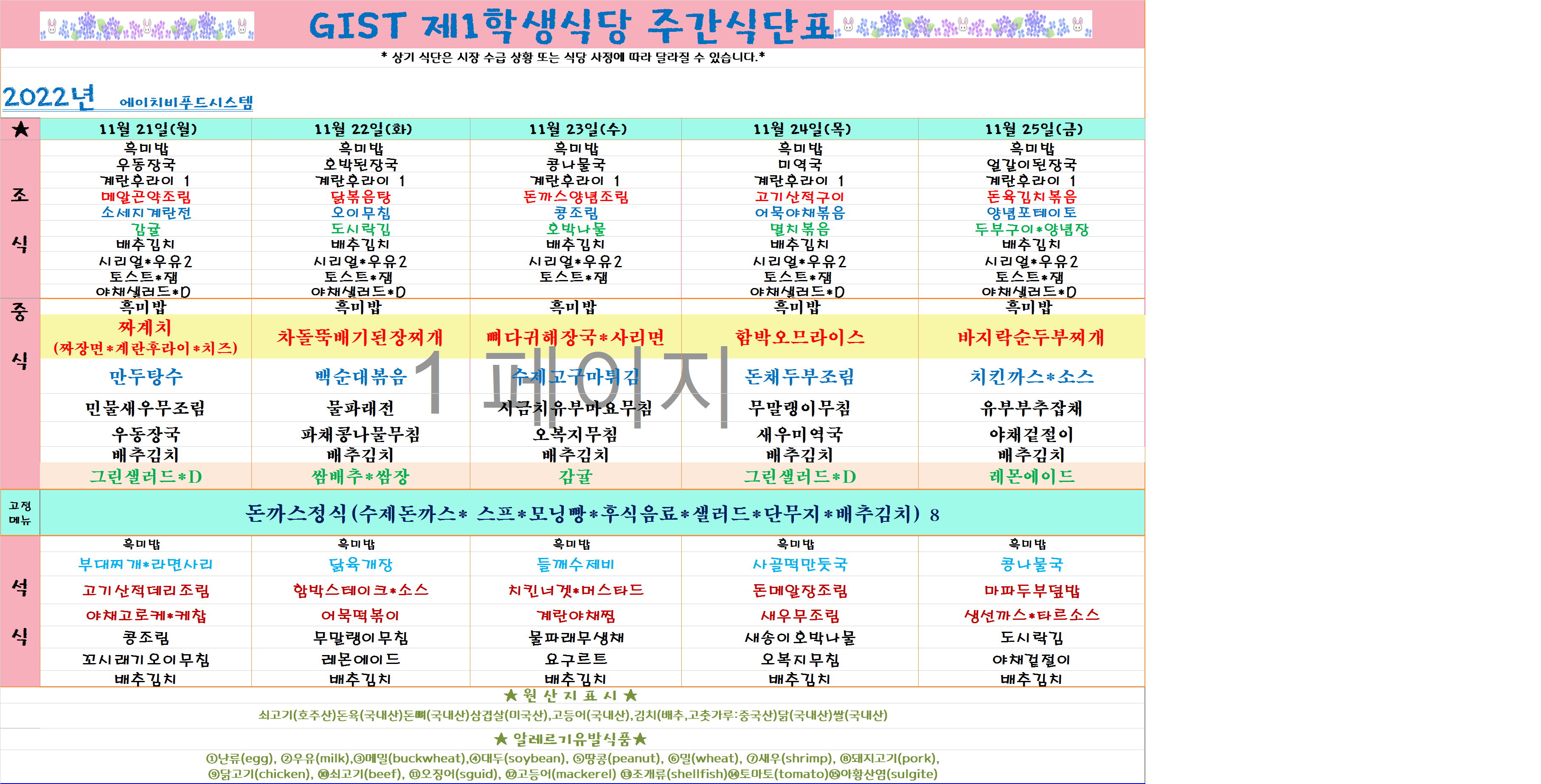 2022년 11월4째주식단표(11월21일~11월25일)