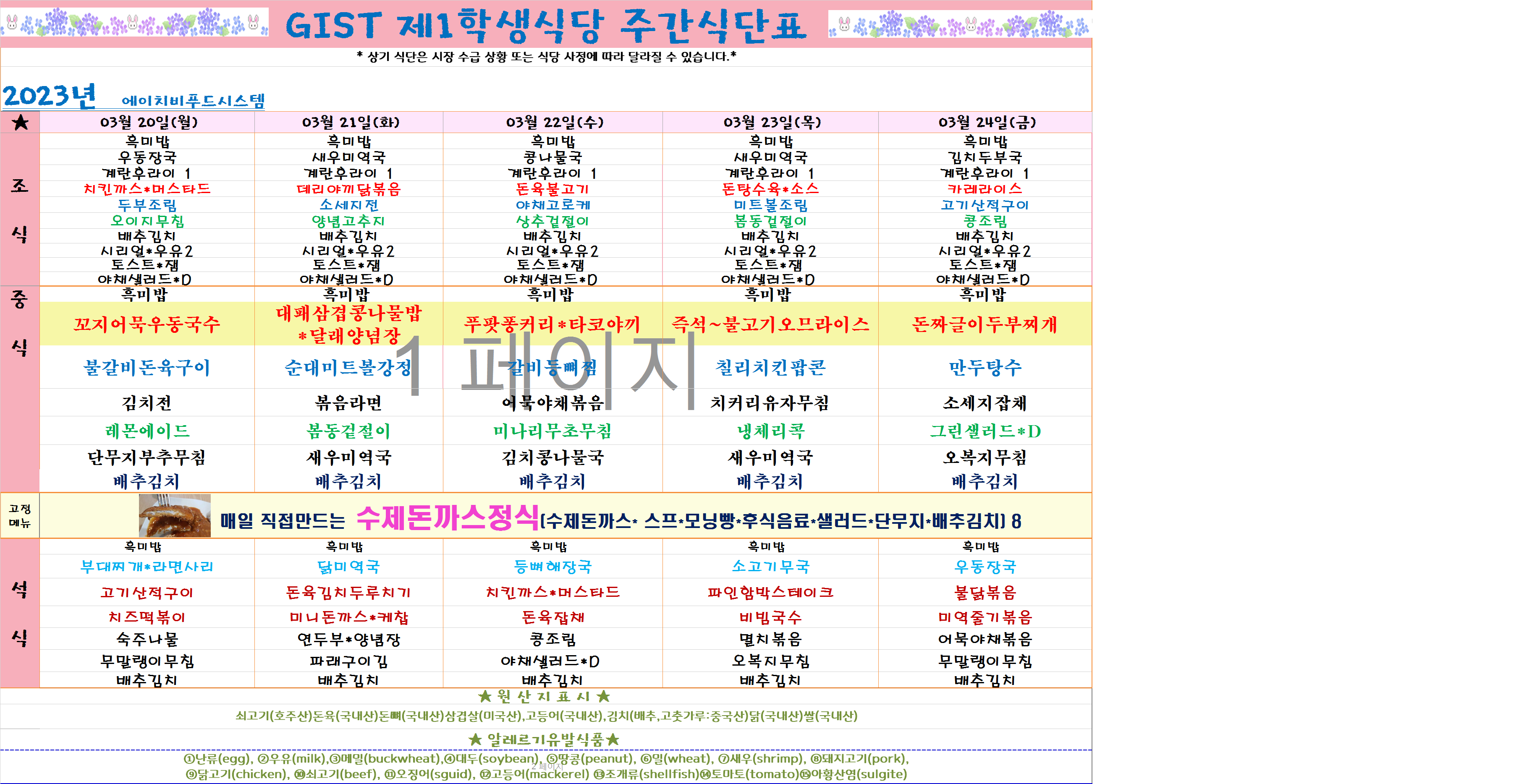 2023년 3월4째주 식단표(3월20일~3월24일)