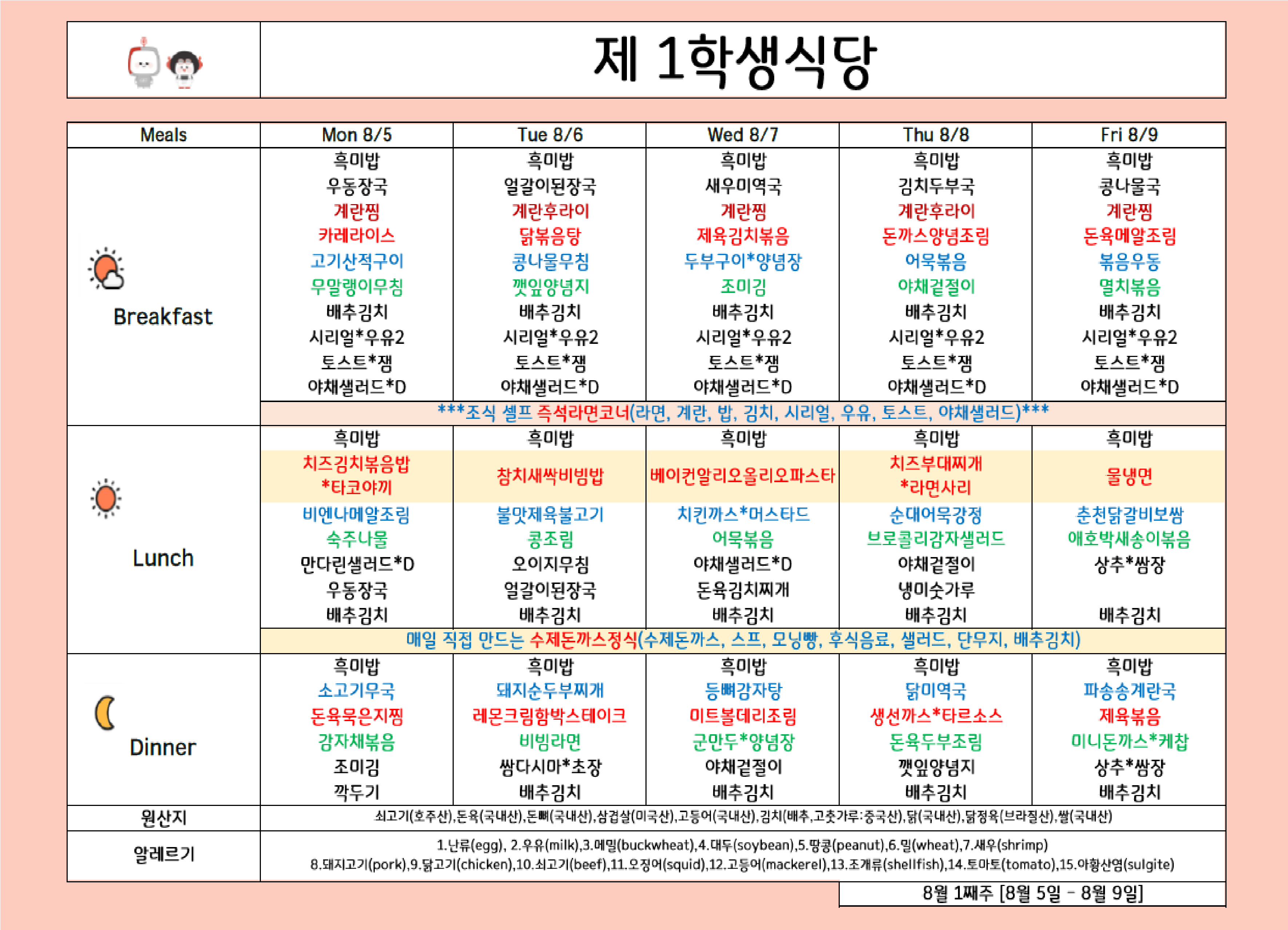 2024년 8월 1주차 식단표 ( 5일 ~ 9일 )