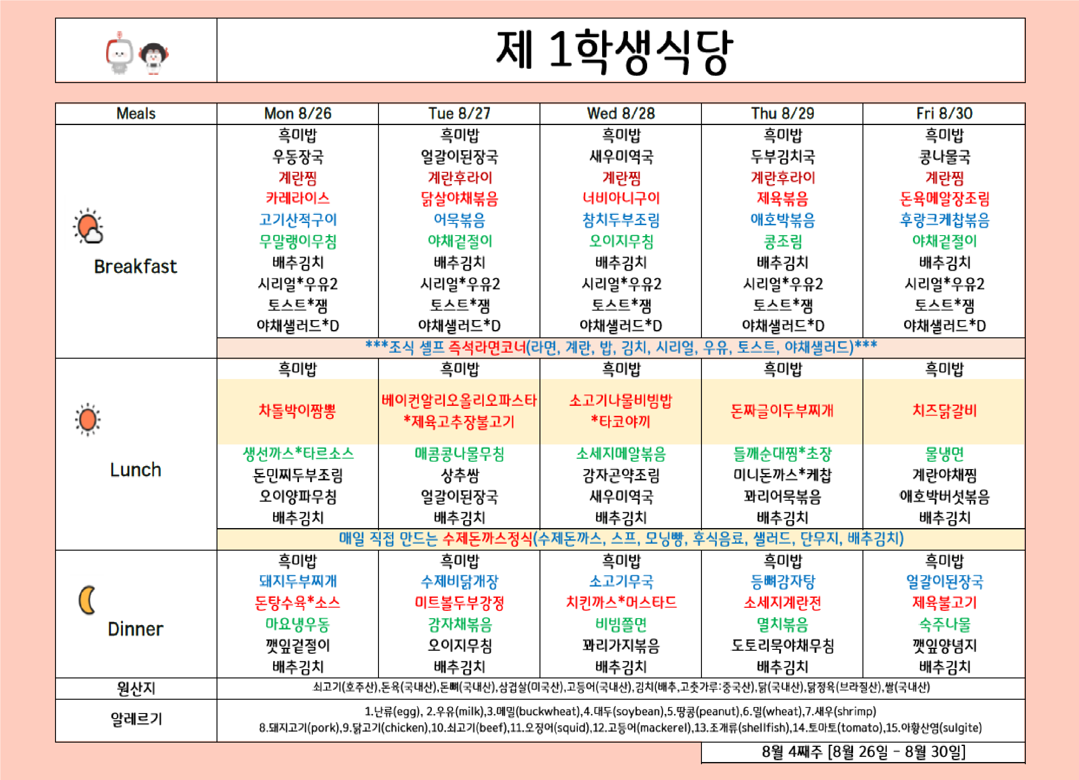 2024년 8월 4주차 식단표 ( 26일 ~ 30일 )