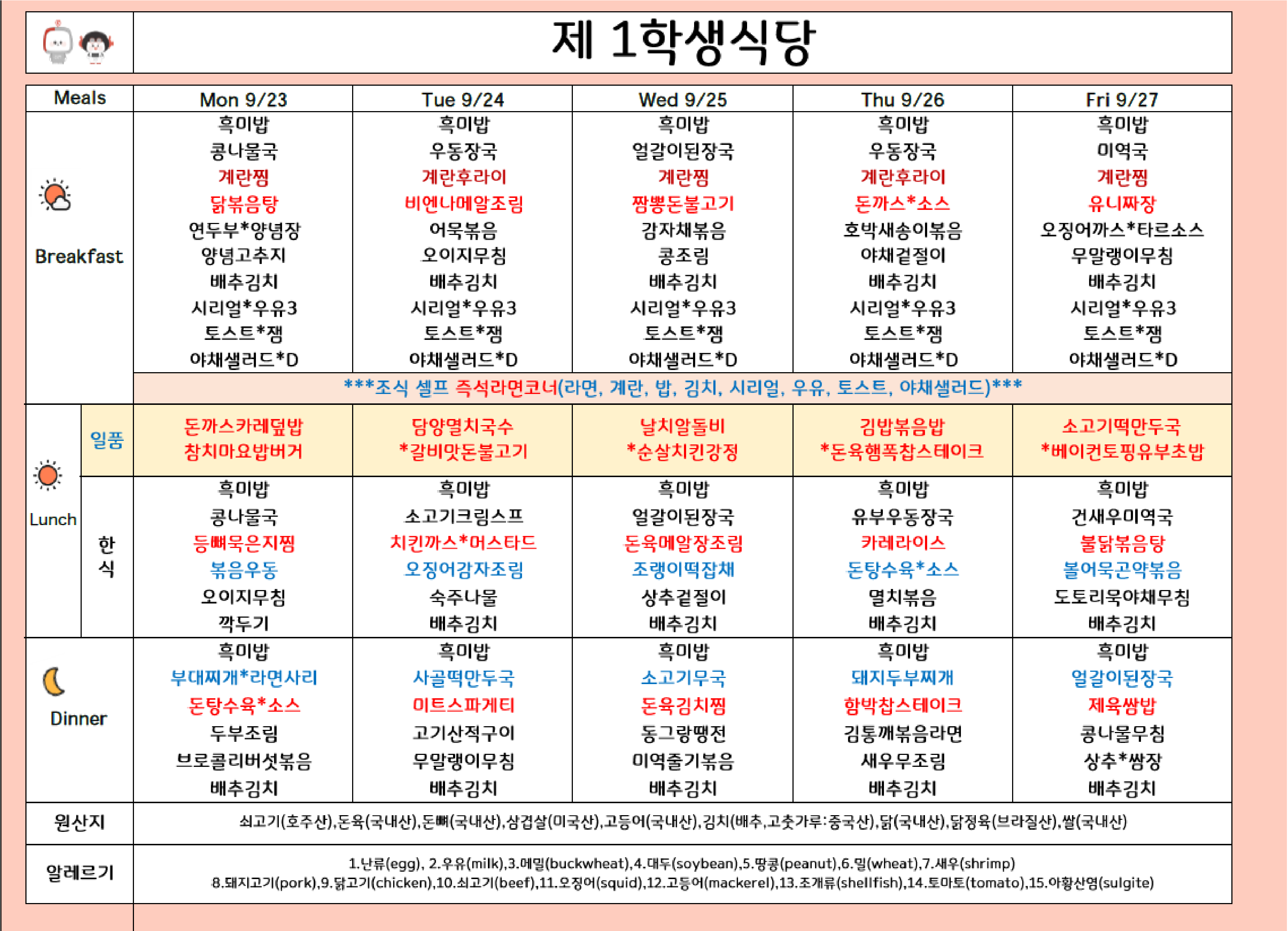 2024년 9월 4주차 식단표 ( 23일 ~ 27일 )